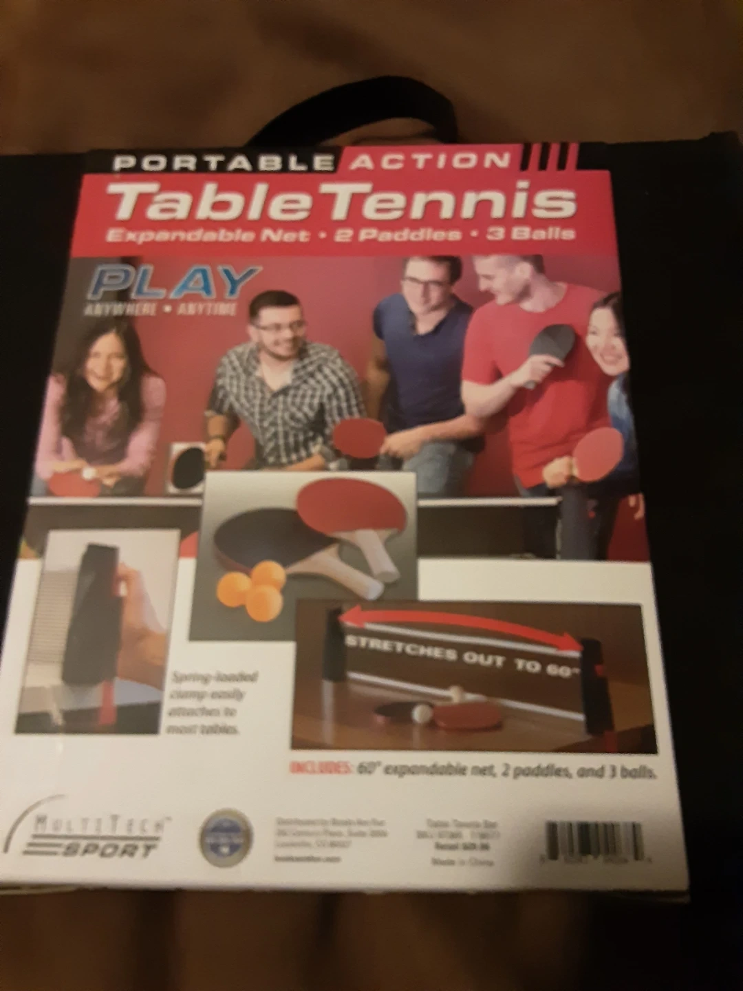 As described on box, it is a portable Table Tennis set, except for a few differences. One out of two paddles has a crossed out name on it, and there are only 2 out of 3 balls. Trying to sell because I can't use it myself.