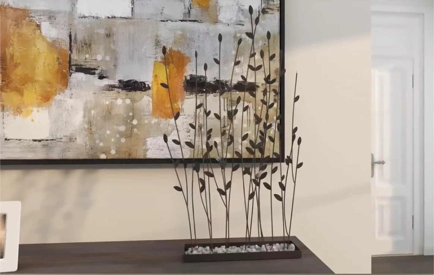 This decorative metal sculpture features tall, slender stalks with small leaves, resembling grass. It's set in a dark rectangular base filled with white pebbles. This piece adds a natural, artistic touch to any shelf or tabletop.
