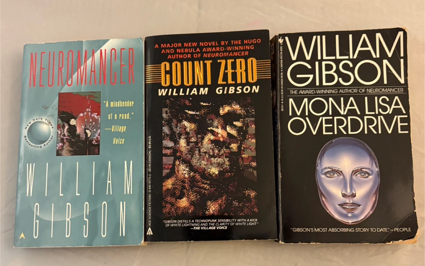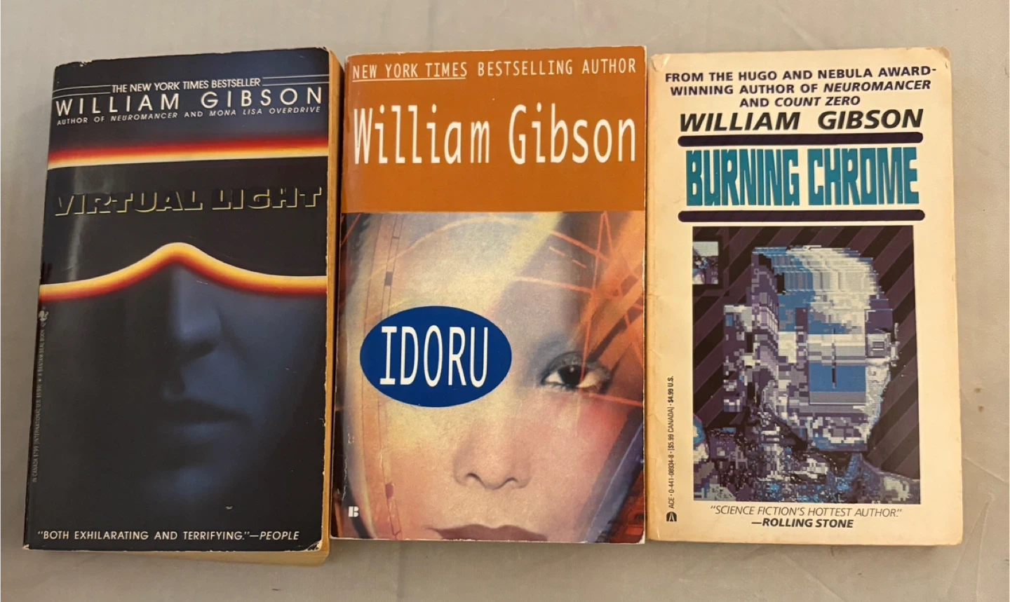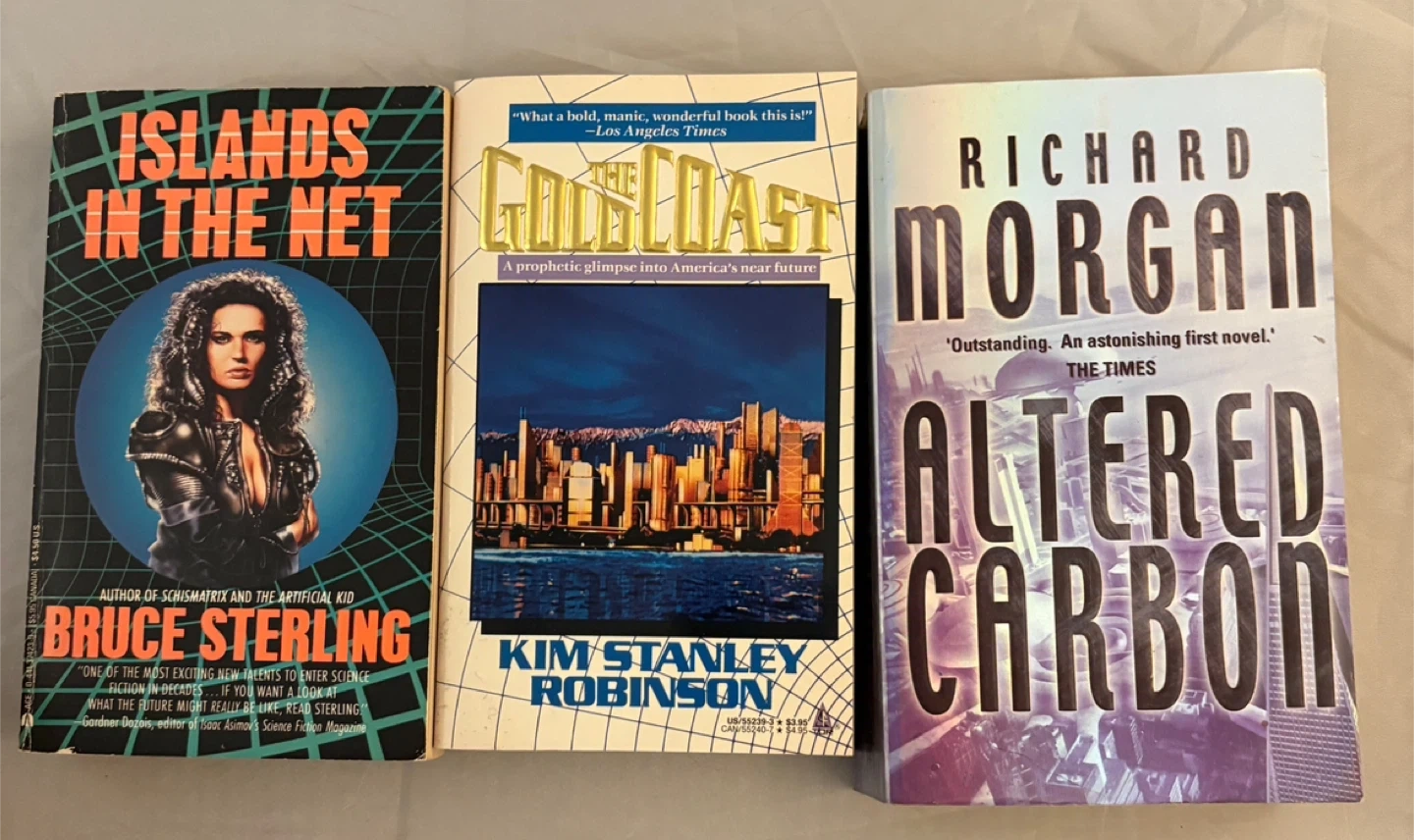 Selling a collection of sci-fi books! Includes: - William Gibson: Virtual Light, Idoru, Burning Chrome, Neuromancer, Count Zero, Mona Lisa Overdrive - Neal Stephenson: Cryptonomicon - Bruce Sterling: Islands in the Net - Kim Stanley Robinson: The Gold Coast - Richard Morgan: Altered Carbon