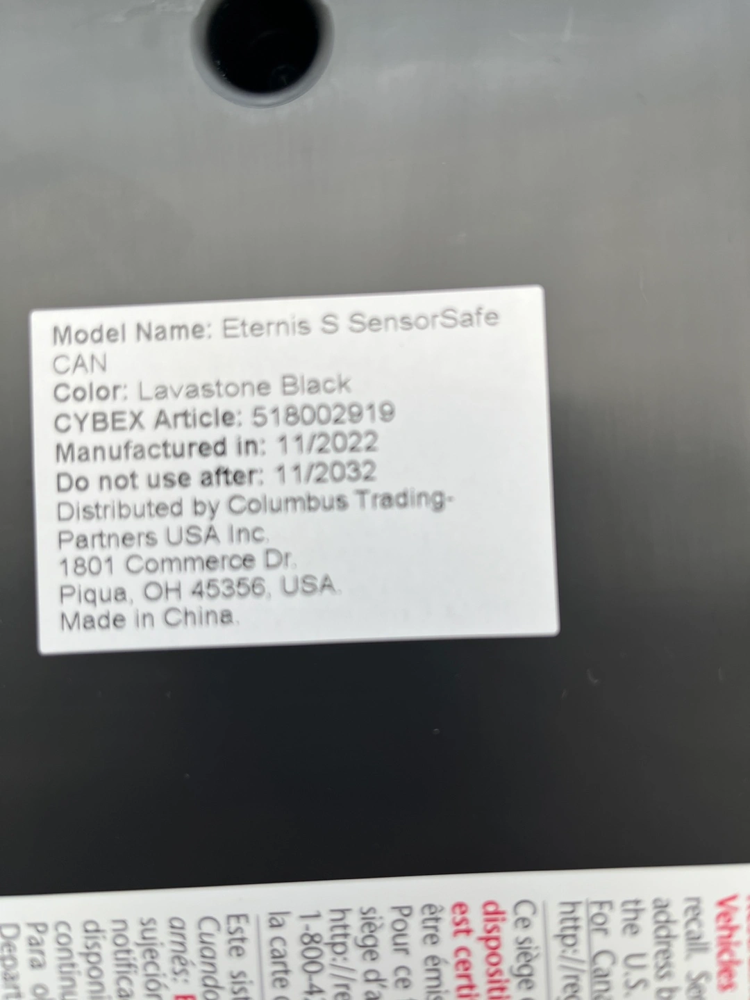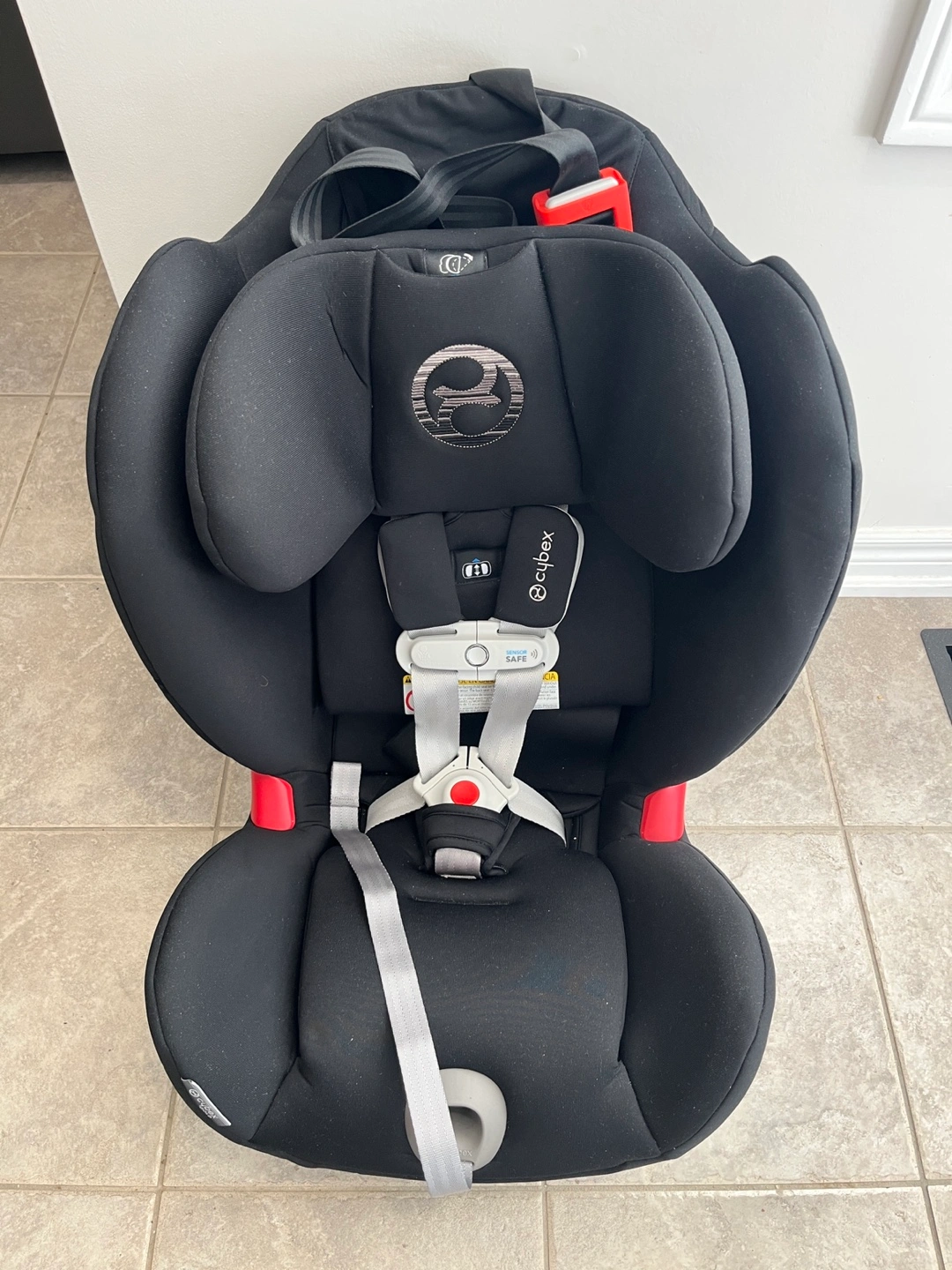 The seat is brand new. Never used. All original components in bag. No box. Selling because it is slightly too large for our car. The CYBEX Eternis S with SensorSafe is the only seat your child will need from birth and beyond. With three modes -- rear-facing, forward-facing and booster, this All-In-One Car Seat is designed for use from 1.8 kg up to 54.4 kg (4 lbs. up to 120 lbs.). This car seat integrates important safety technology into the chest clip of harness to alert when unsafe situations arise. The alerts are provided through a vehicle receiver and the caregiver’s smartphone to ensure safety for children in a range of situations. Features Three modes: Rear-facing from 1.8 kg to 22.7 kg (4 lbs. to 50 lbs.), Forward-facing from 10 kg to 29.5 kg (22 lbs. to 65 lbs.), Belt-positioning Booster from 18 kg to 54.4 kg (40 lbs. to 120 lbs.) Smart-tech harness chest clip with SensorSafe provides alerts when unsafe situations arise in the back seat (not used in Belt-positioning Booster mode) Linear Side-impact Protection absorbs up to 25% more impact forces in a collision* 3-position reclining headrest helps prevent the child's head from falling forward while asleep, keeping the head and neck in a safe position In-seat recline provides correct ergonomic positioning and extra legroom, allowing your child to ride rear-facing longer 12-position, height-adjustable headrest with no-rethread harness 6-position one-hand adjustable recline for the best fit to your car Magnetic buckle holders for easy entry and exit from the seat Anti-rebound bar provides additional protection in the event of a crash by reducing car seat rebound movement Removable newborn insert provides support from 2.3 kg to 5 kg (5 lbs. to 11 lbs.) Dishwasher safe cup holder can be positioned on either side Harness pads and 2-position padded buckle Steel reinforced frame provides strength and durability Energy absorbing shell and base help reduce the forces felt by the child in a collision Dual Belt adjusters to ensure a tight fit Dual-level indicators to help ensure the proper angle Innovative one-pull LATCH removal system LATCH Connection storage provided under the seat when not in use Designed and engineered in Germany *when compared to the same car seat without L.S.P. extended How SensorSafe Works Originally developed to help prevent the rising number of infant hot car deaths, SensorSafe will chime through the installed vehicle receiver to alert when a child is still secured in the back seat after the car has been switched off. This reminds the caregiver to act quickly, but if the child is still secured after several minutes an alert will be sent to the caregiver’s cellphone through the downloaded app. If the situation is still not remedied, the designated emergency contact will receive an alert with the GPS coordinates of the vehicle’s last known position. This state-of-the-art safety technology is designed so there is no need to reinstall each time you drive. For ease, just keep the receiver plugged into your car’s OBD port to drive with that extra peace of mind. Features Chimes through the installed vehicle receiver if child is still secured in the seat when the car is switched off Alerts through the caregiver’s cell phone if the child is left behind in the vehicle secured in the car seat and then alerts the designated emergency contact if the situation is still not remedied Emergency contact receives GPS coordinates of the vehicle’s last known position Alerts through the vehicle receiver and caregiver’s smart phone when the child has unbuckled their chest clip while the vehicle is in motion Monitors the back seat temperature to alert through the vehicle receiver and the caregiver’s smart phone when the back seat appears to be too hot or too cold for the child’s comfort Provides warnings to the caregiver when the child may have been seated for too long and needs a break Receiver plugs directly into your car’s OBD port and syncs with the caregiver’s cell phone Only one install needed if receiver is kept plugged into vehicle’s OBD port