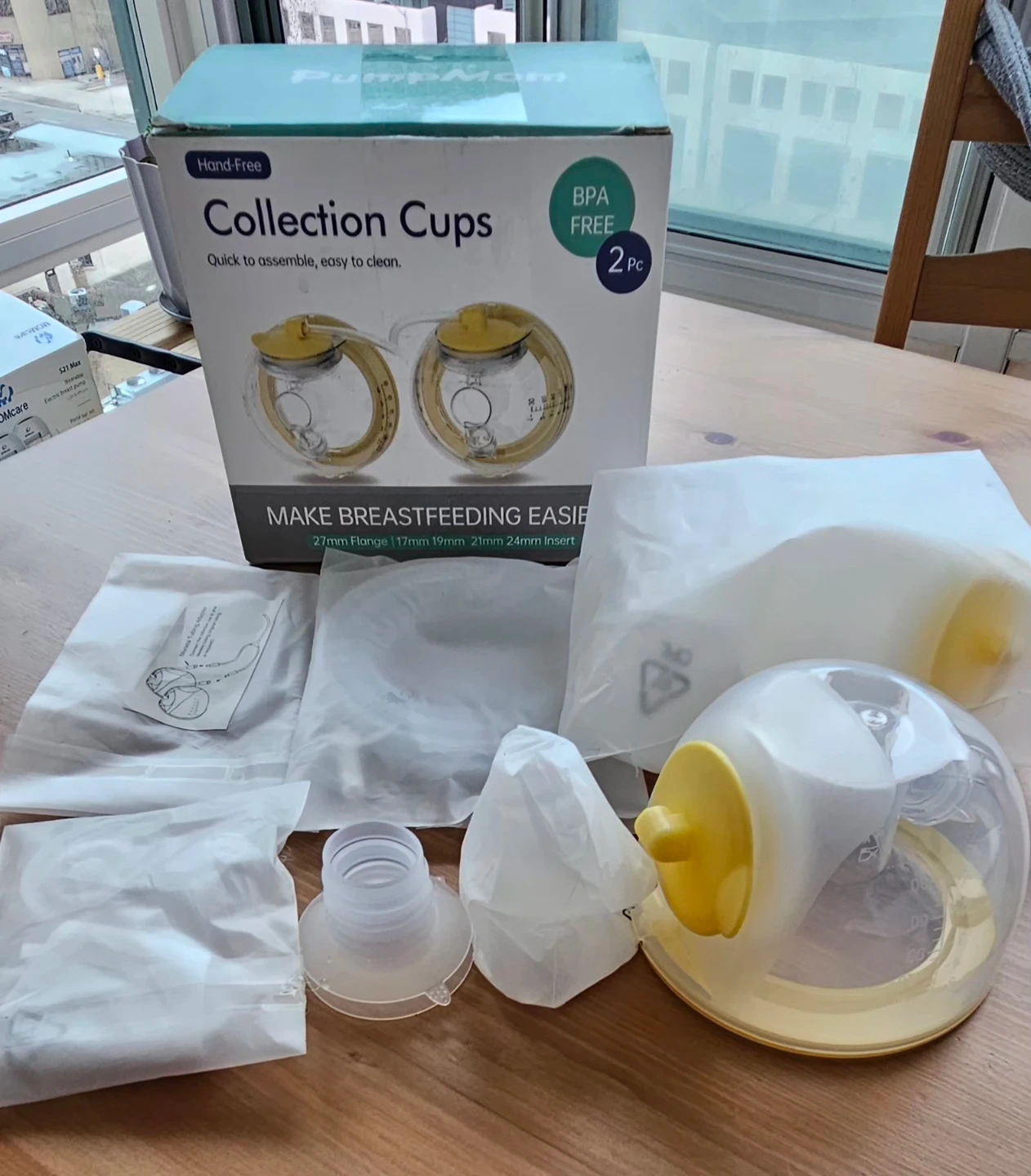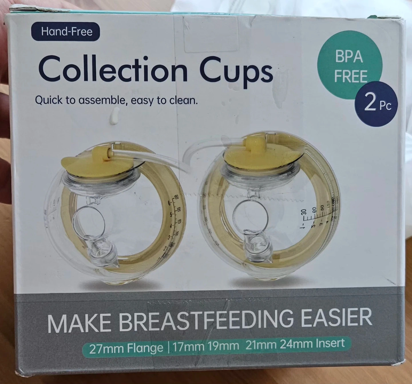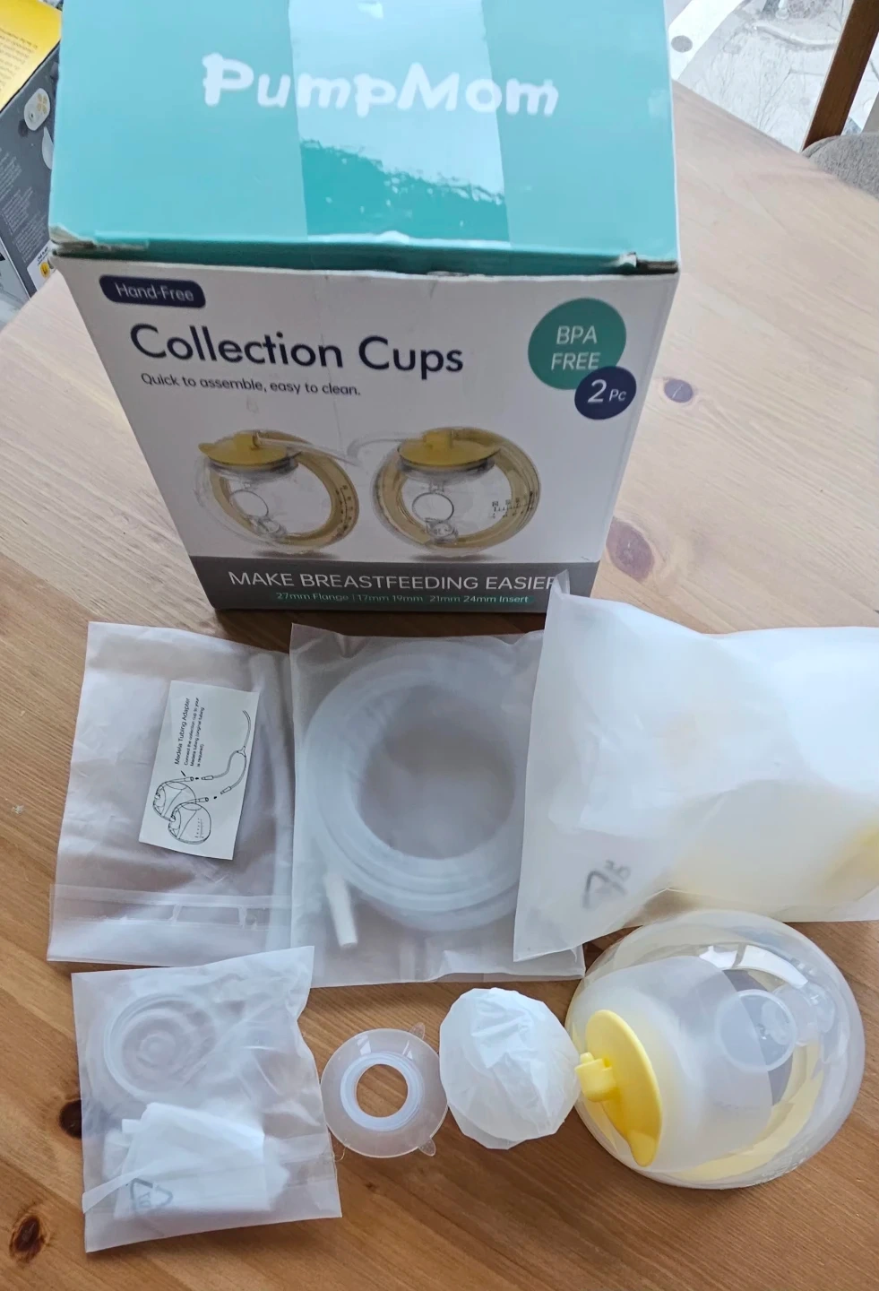 Set of two PumpMom hand-free collection cups for breastfeeding. Includes 27mm flange, 17mm, 19mm, and 21mm inserts. BPA free and easy to clean. Make breastfeeding easier!