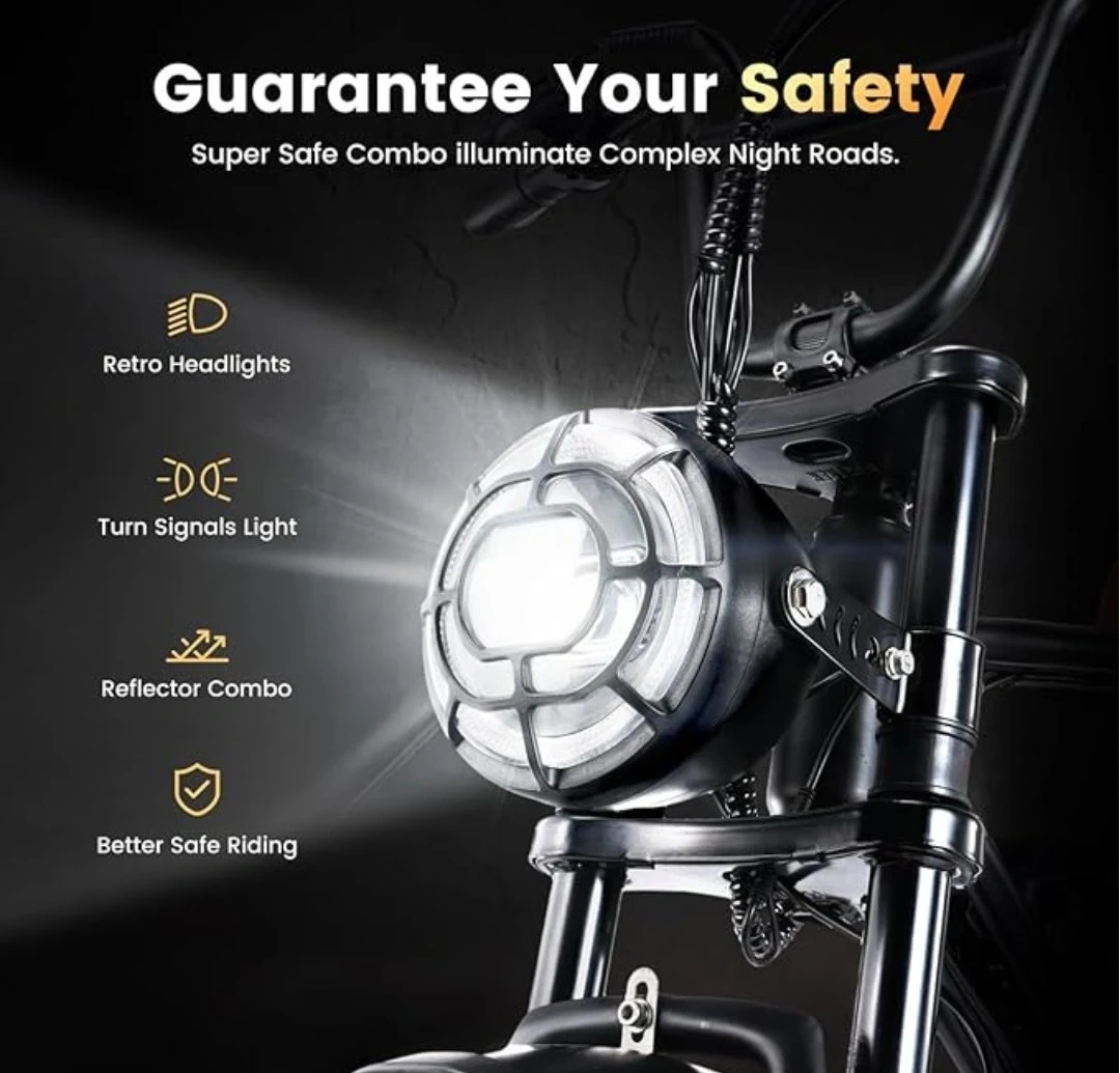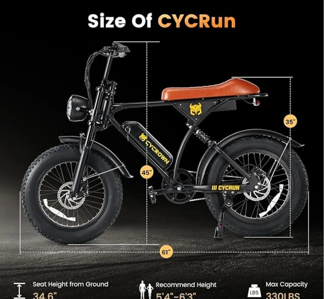 5Selling a CYCROWN electric bike! It features a 750W brushless motor and a hydraulic suspension fork for a smooth ride. The bike has a retro headlight and turn signals for safety. It can handle up to a 20° incline and has a maximum speed of 20MPH. Recommended rider height is 5'4"-6'3". Max capacity is 330 lbs
