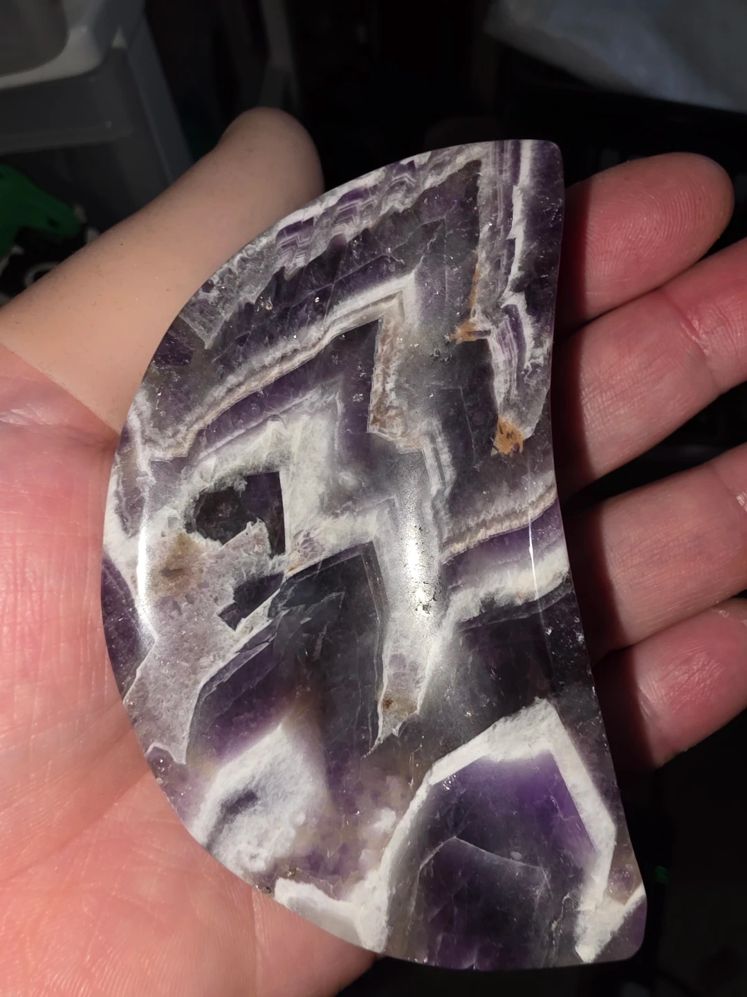 This is a beautiful trinket moon dish dream amethyst. Its unique banding features shades of deep purple and white. Great for display or energy work! Place your jewelry in it. Etransfer to hold.