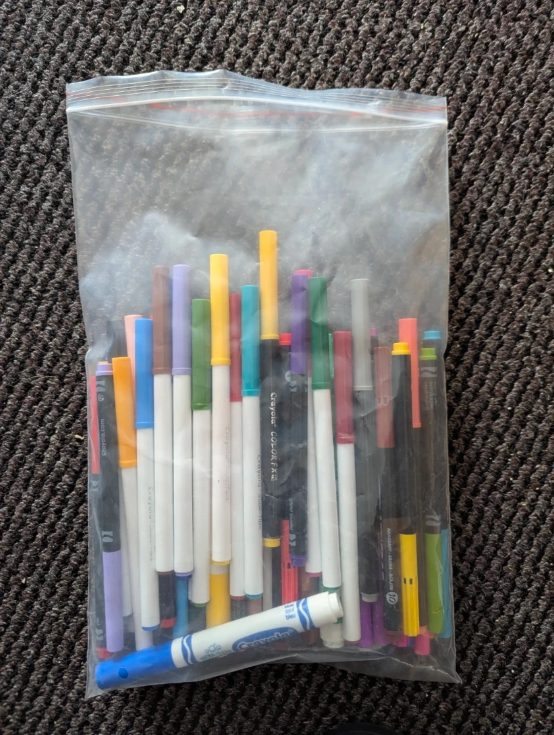 This is a large bag of assorted Crayola markers. They're great for drawing and colouring! Comes in a variety of colours.