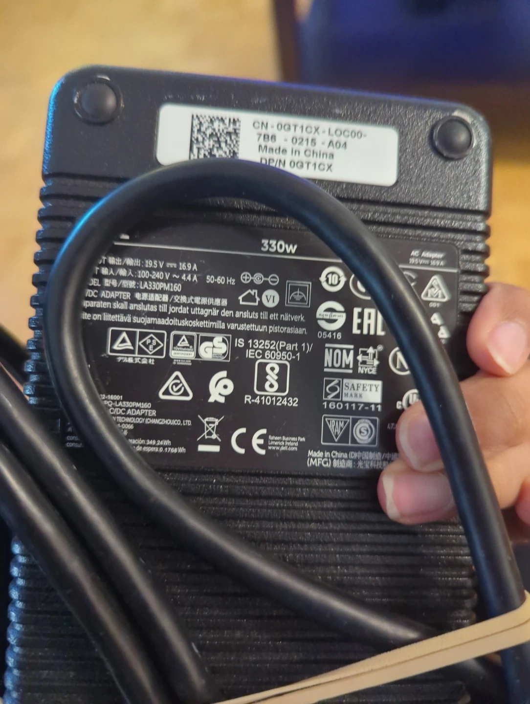 This is a Dell charger 330W, DP/N 0GT1CX, 100-240V, compatible devices