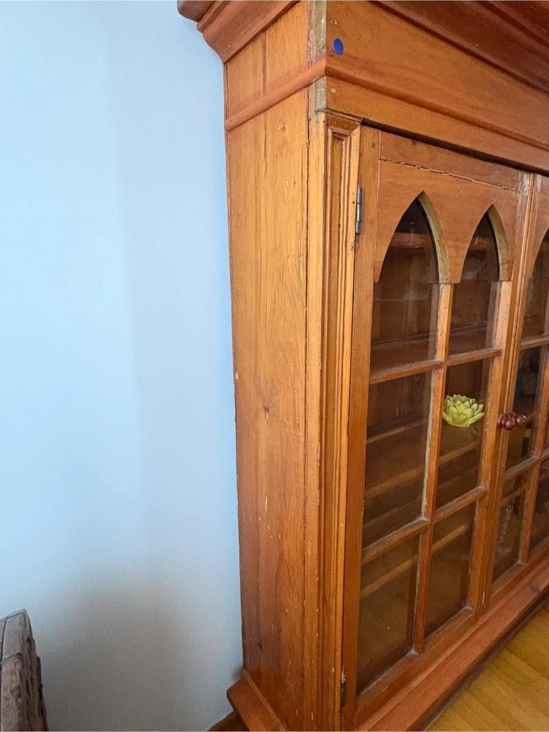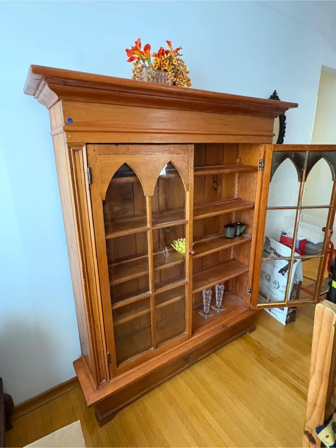 Vintage wooden display cabinet with arched glass doors. Features multiple shelves for storage and display. Solid wood construction.