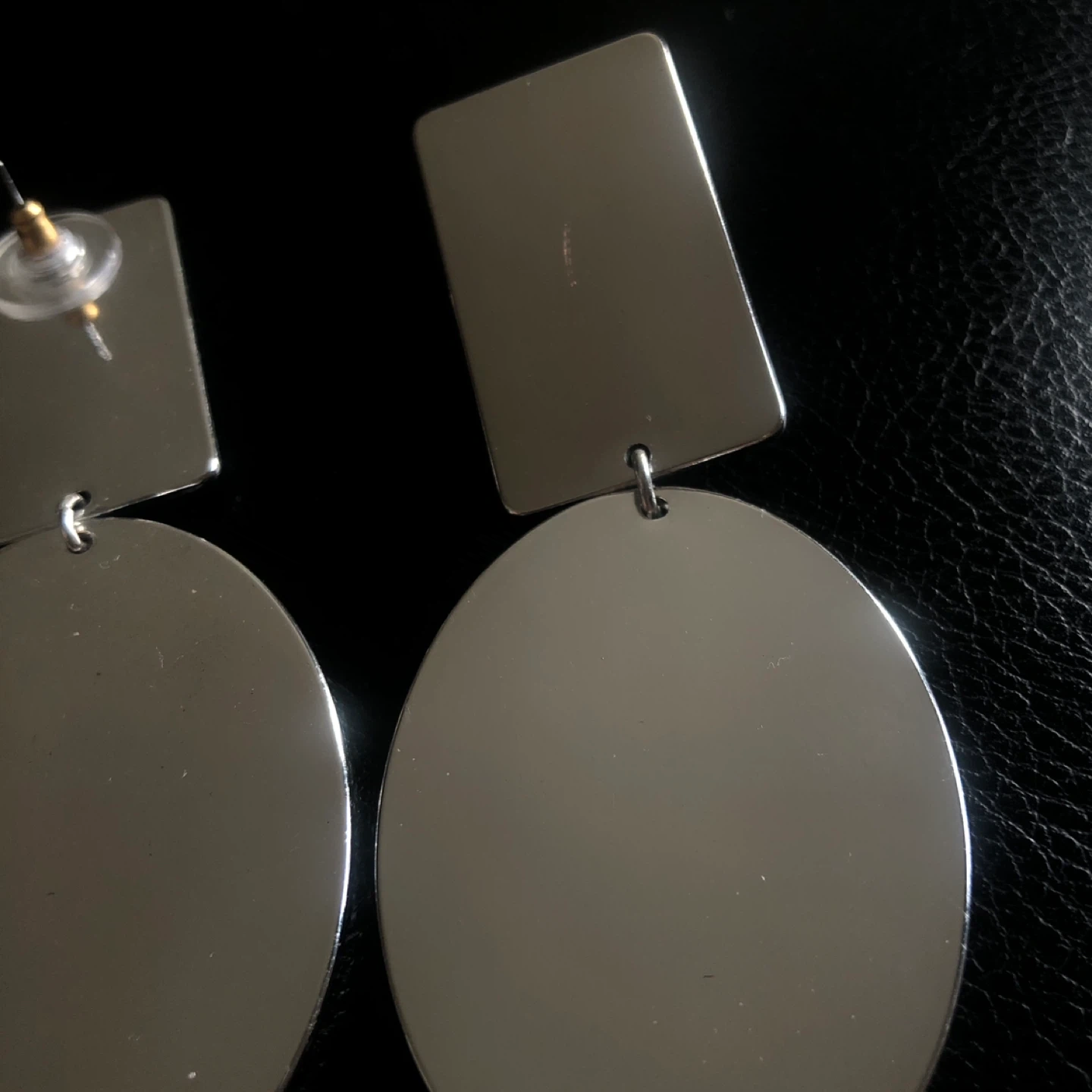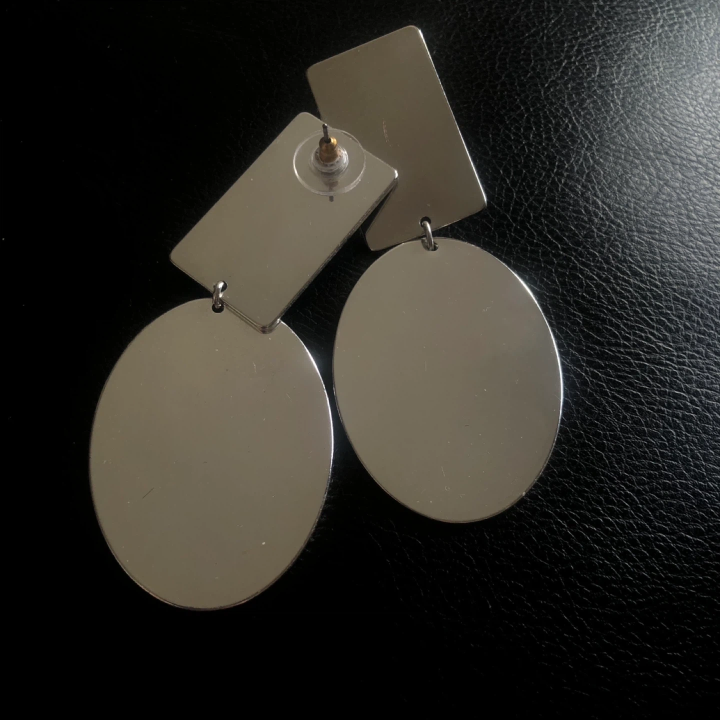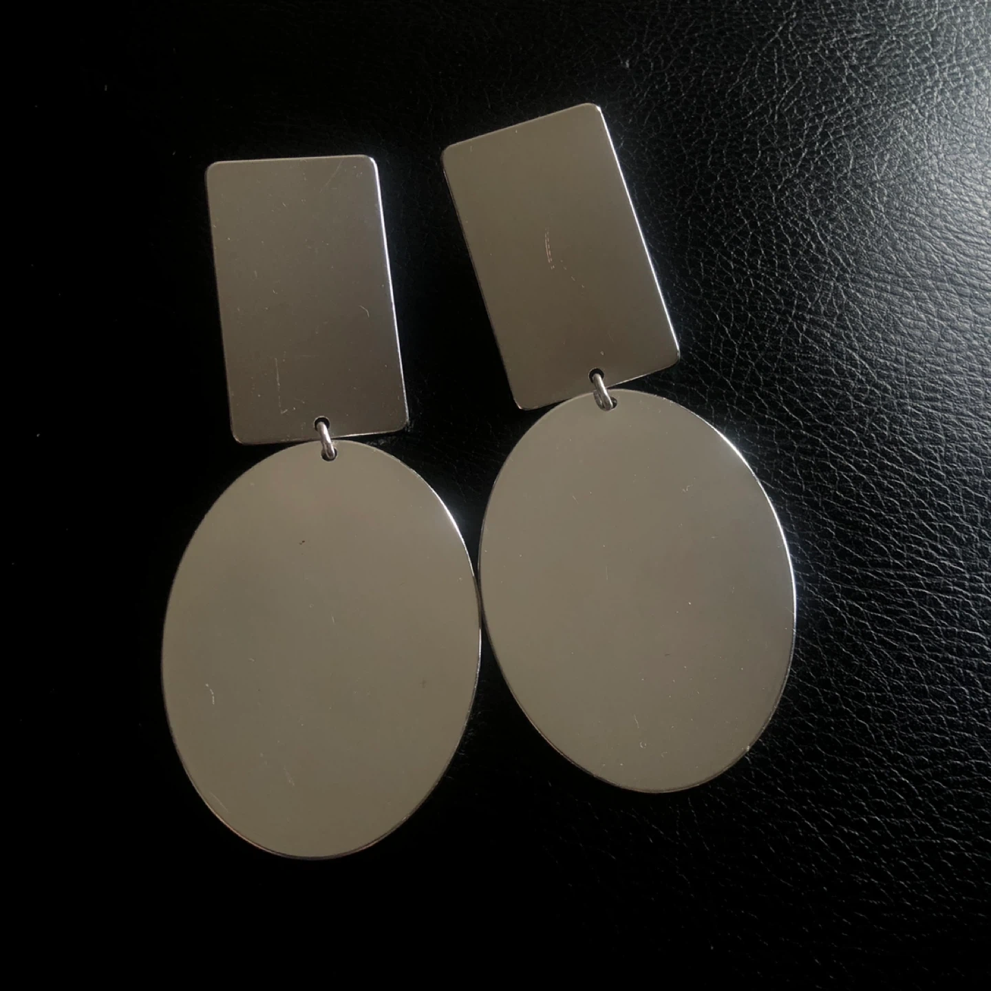 These striking earrings feature a modern geometric design. They're a pair of statement drop earrings with a rectangular top piece and a large oval dangle. Silver-tone metal construction.