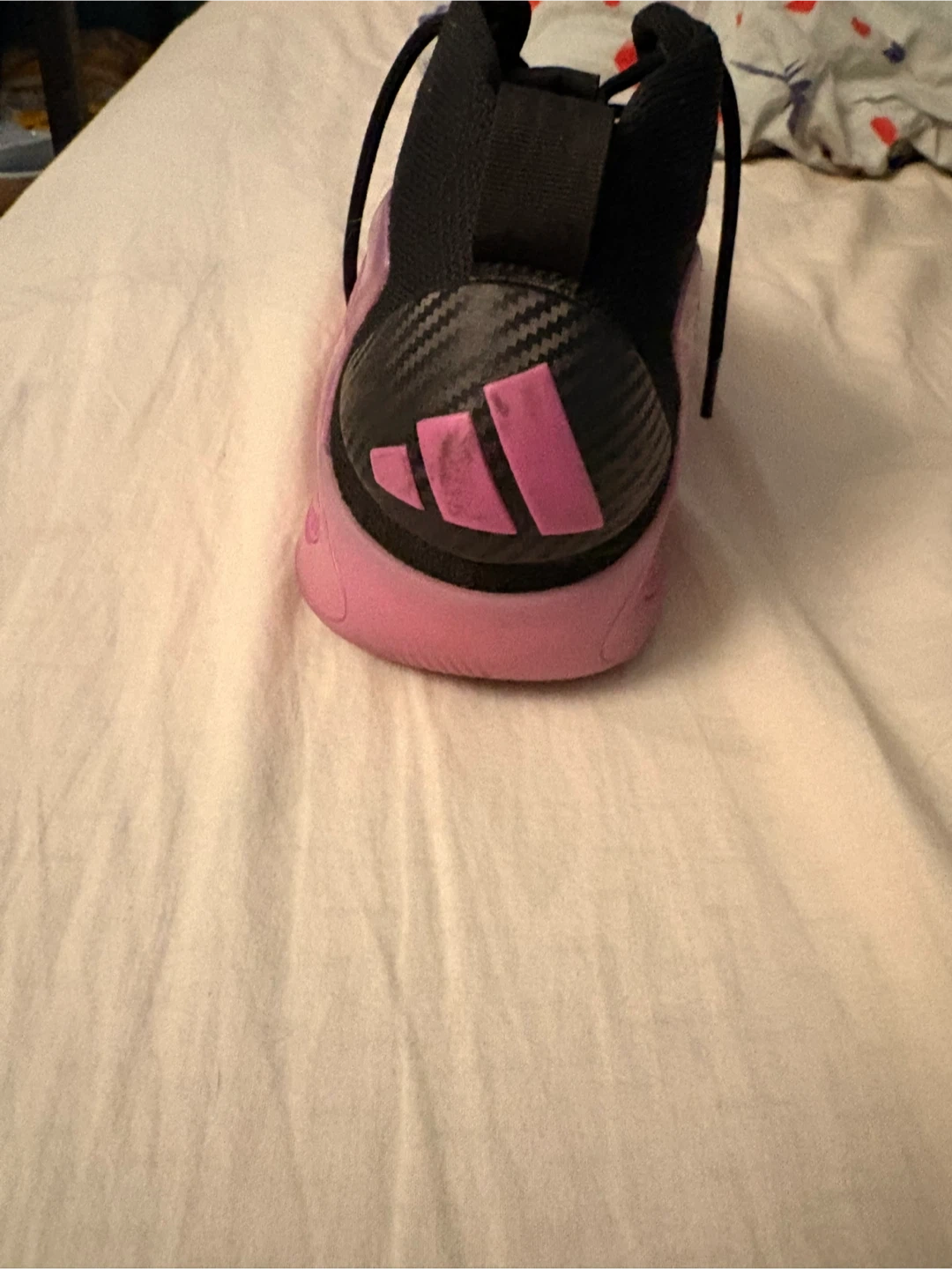 These Adidas basketball shoes are pink and black. They're built for performance on the court. The sole has a honeycomb pattern. It's a stylish and functional shoe!
