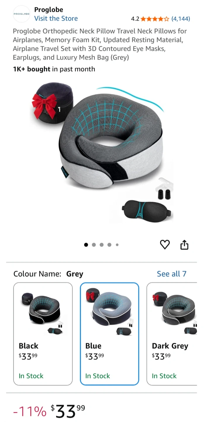 New Proglobe Orthopedic Neck Pillow Travel Neck Pillows for Airplanes, Memory Foam Kit, Updated Resting Material, Airplane Travel Set with 3D Contoured Eye Masks, Earplugs, and Luxury Mesh Bag (Grey)