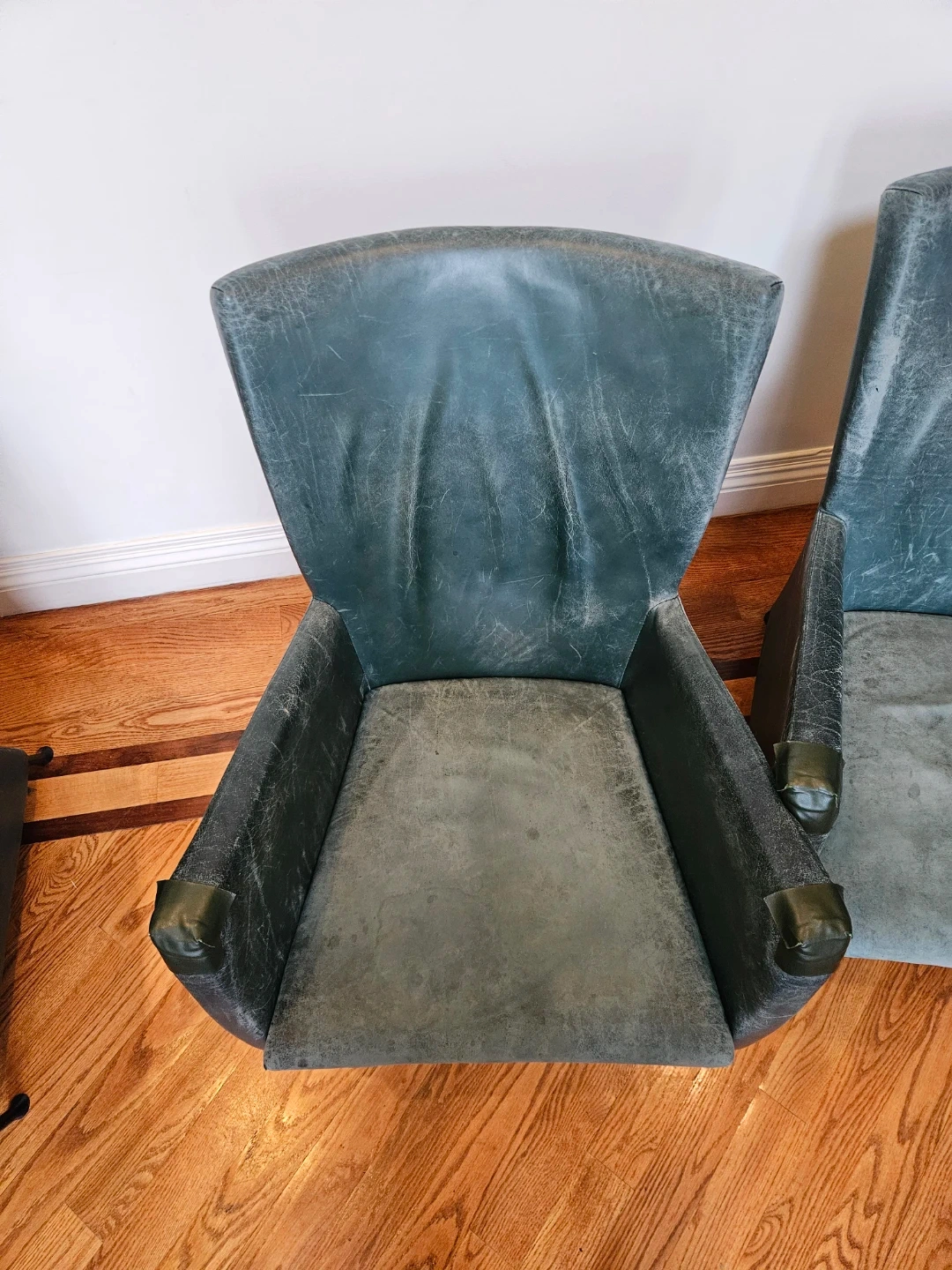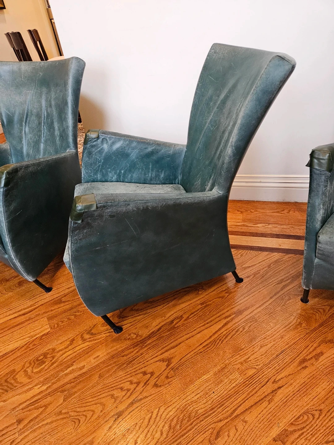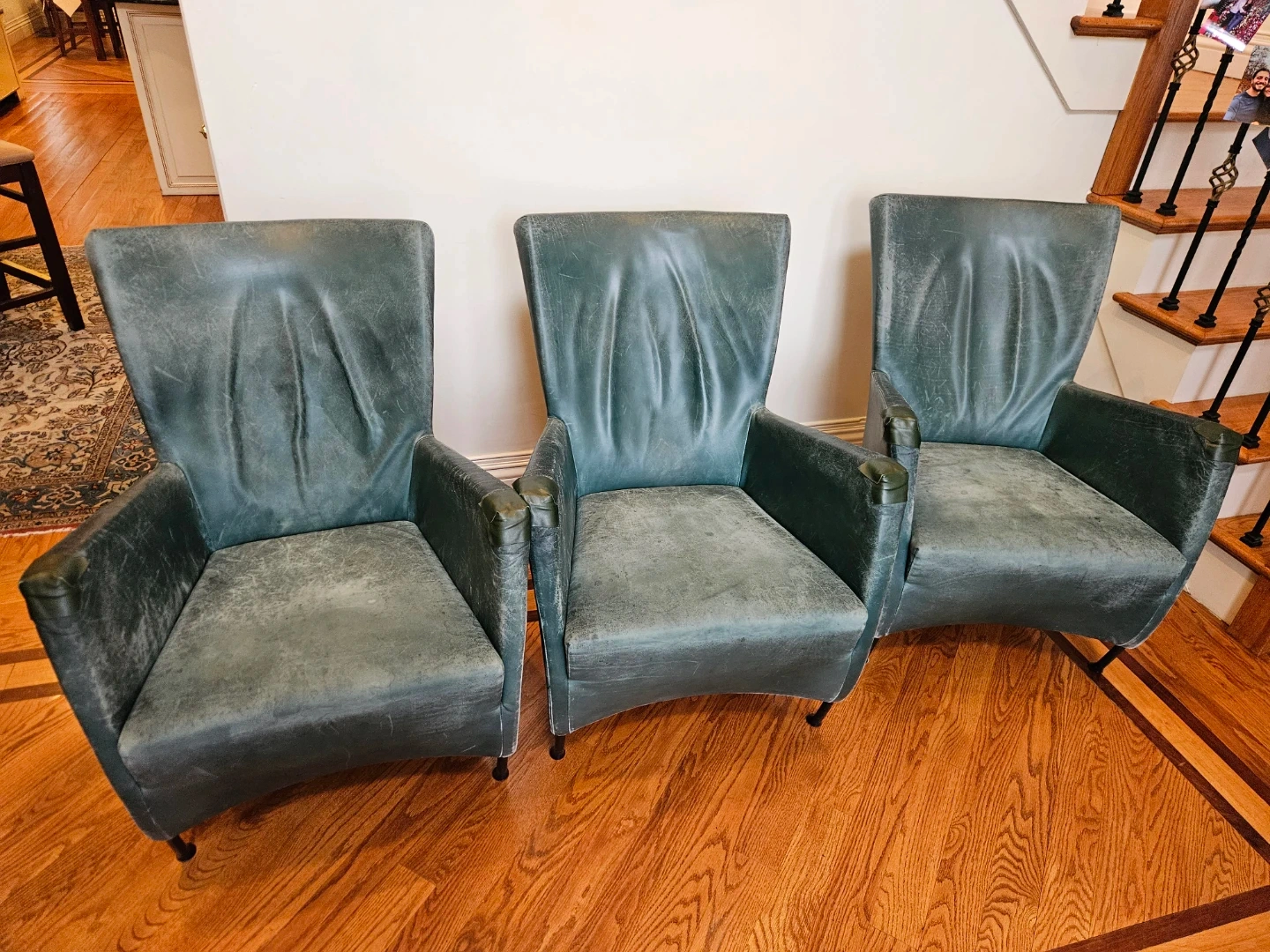 These are three green Italien Designer leather armchairs with a unique, modern design. They're upholstered in distressed leather and feature sleek metal legs. Each chair offers a comfortable seating experience.Orginal price was $1500/each