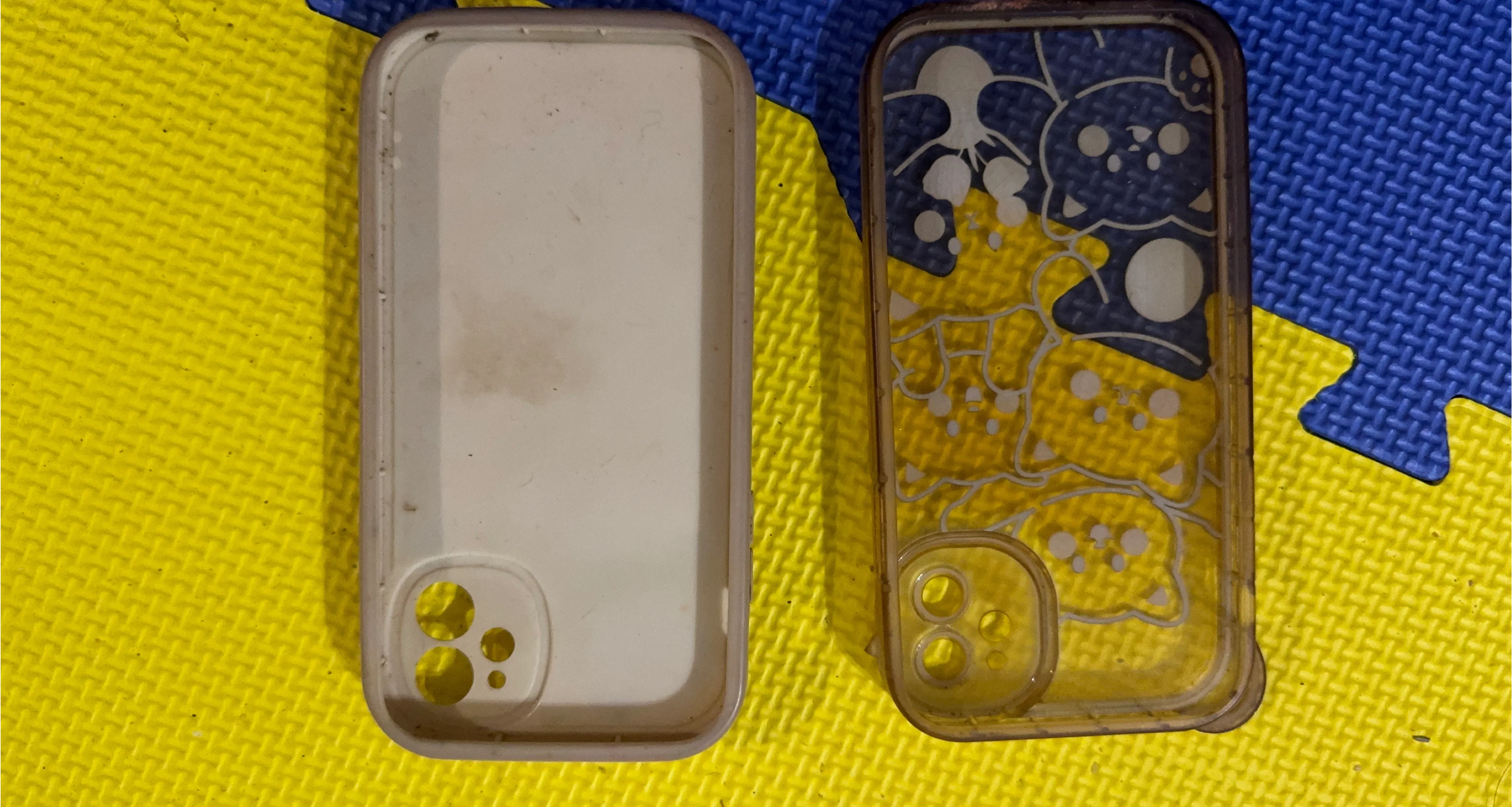 It's a cute phone case with a yellow bear and flower design. It's made of clear plastic with a quilted white backing. This case is designed for an iPhone 11. $ 2 for both