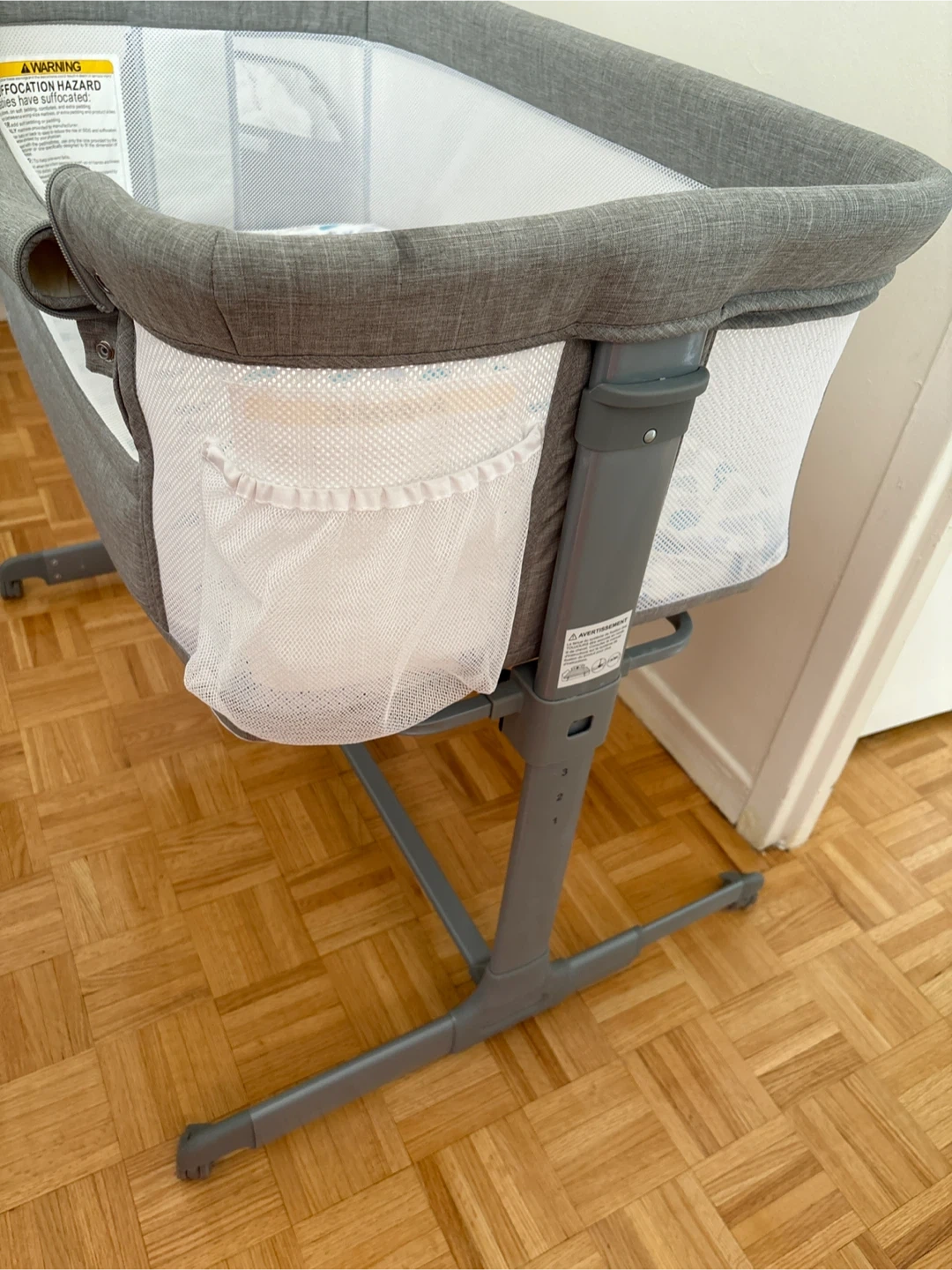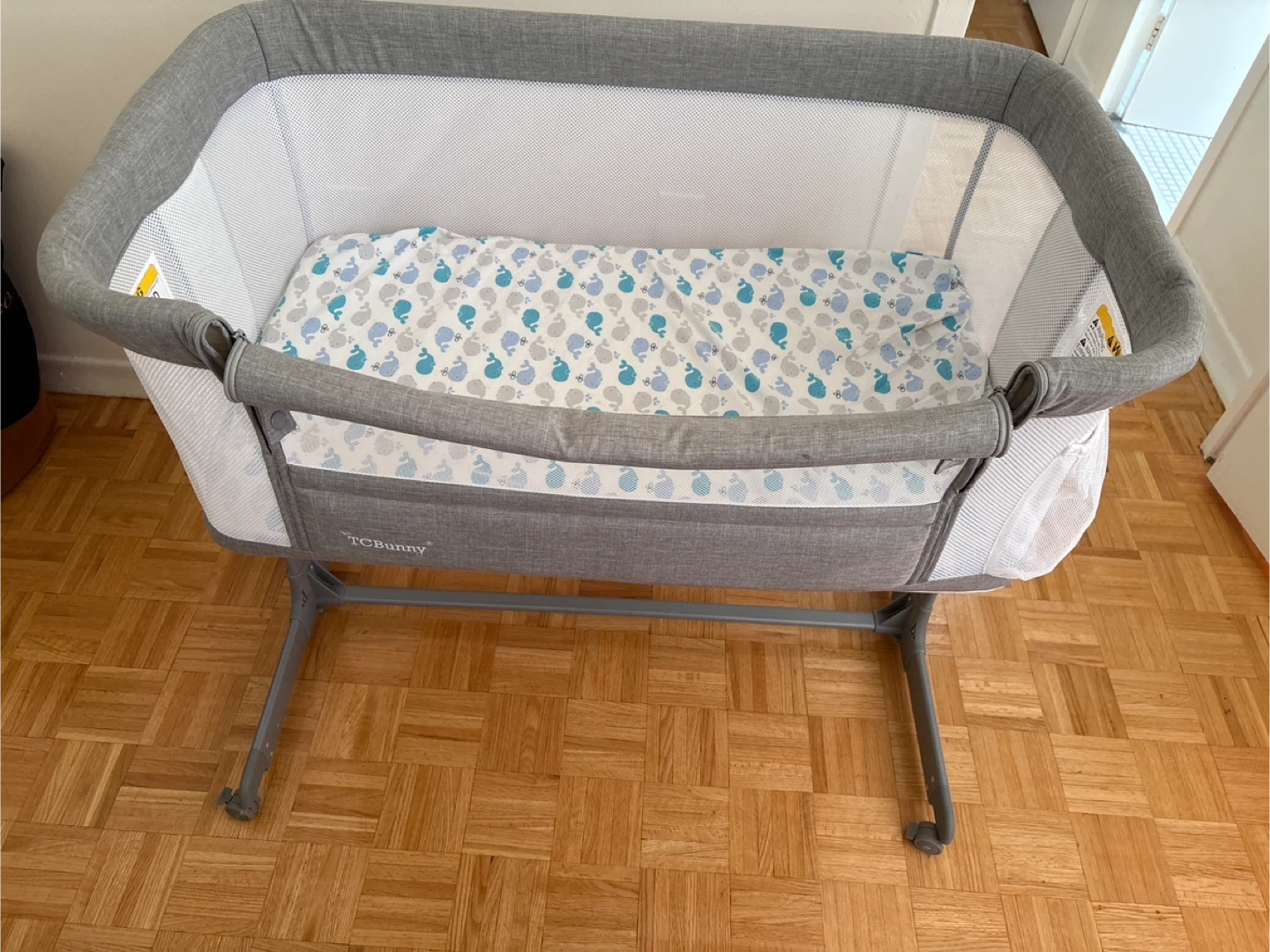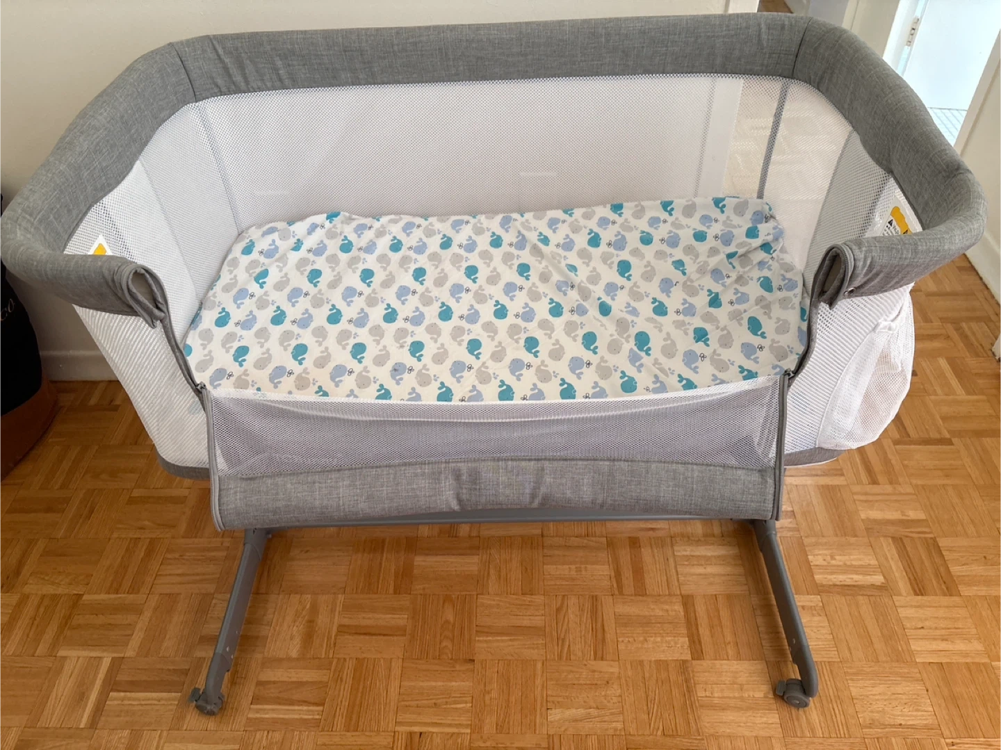 TCBunny bedside bassinet. Grey fabric with a whale pattern mattress. Mesh sides for ventilation. Storage pockets on the side. Wheels for easy movement.