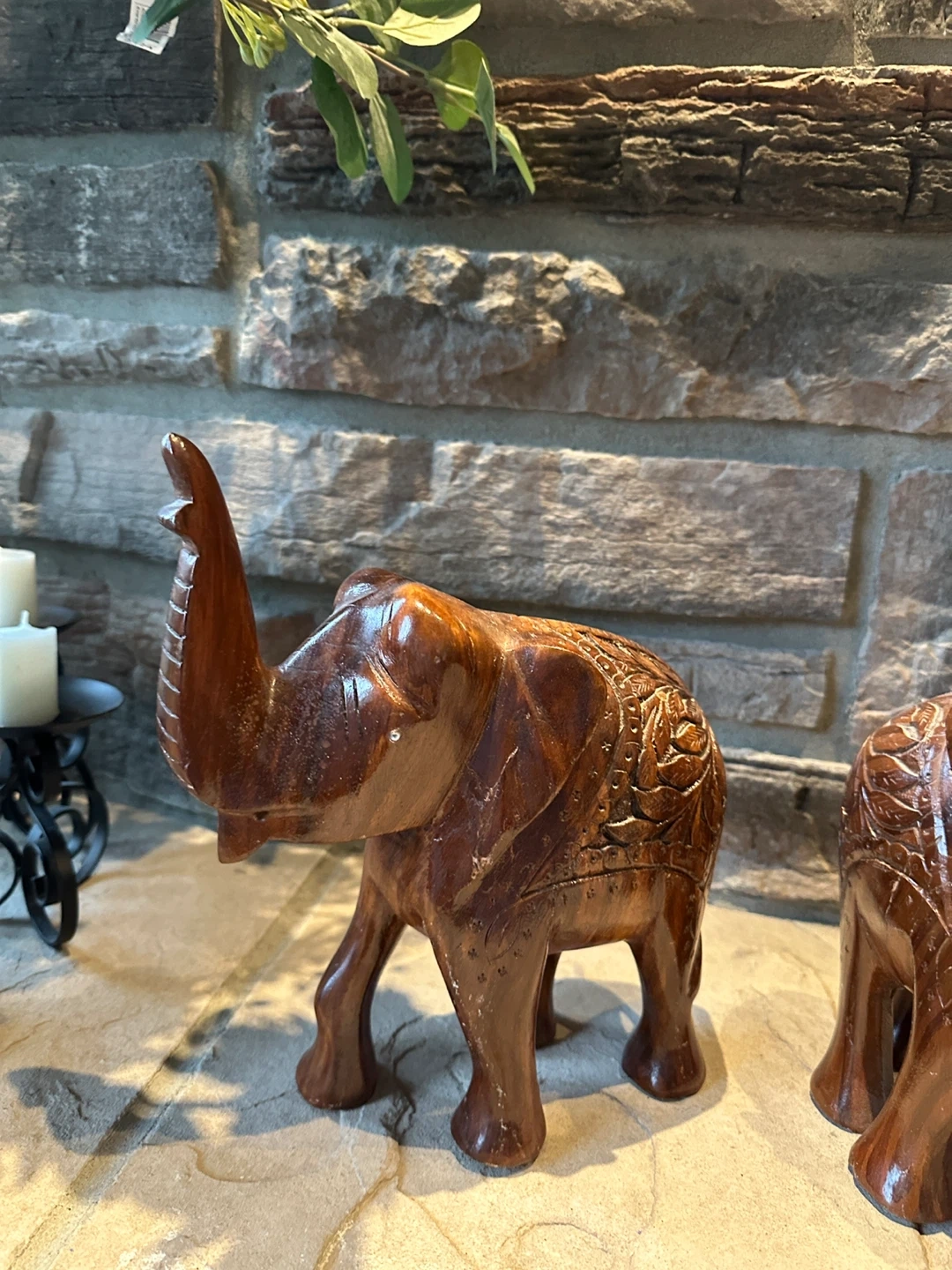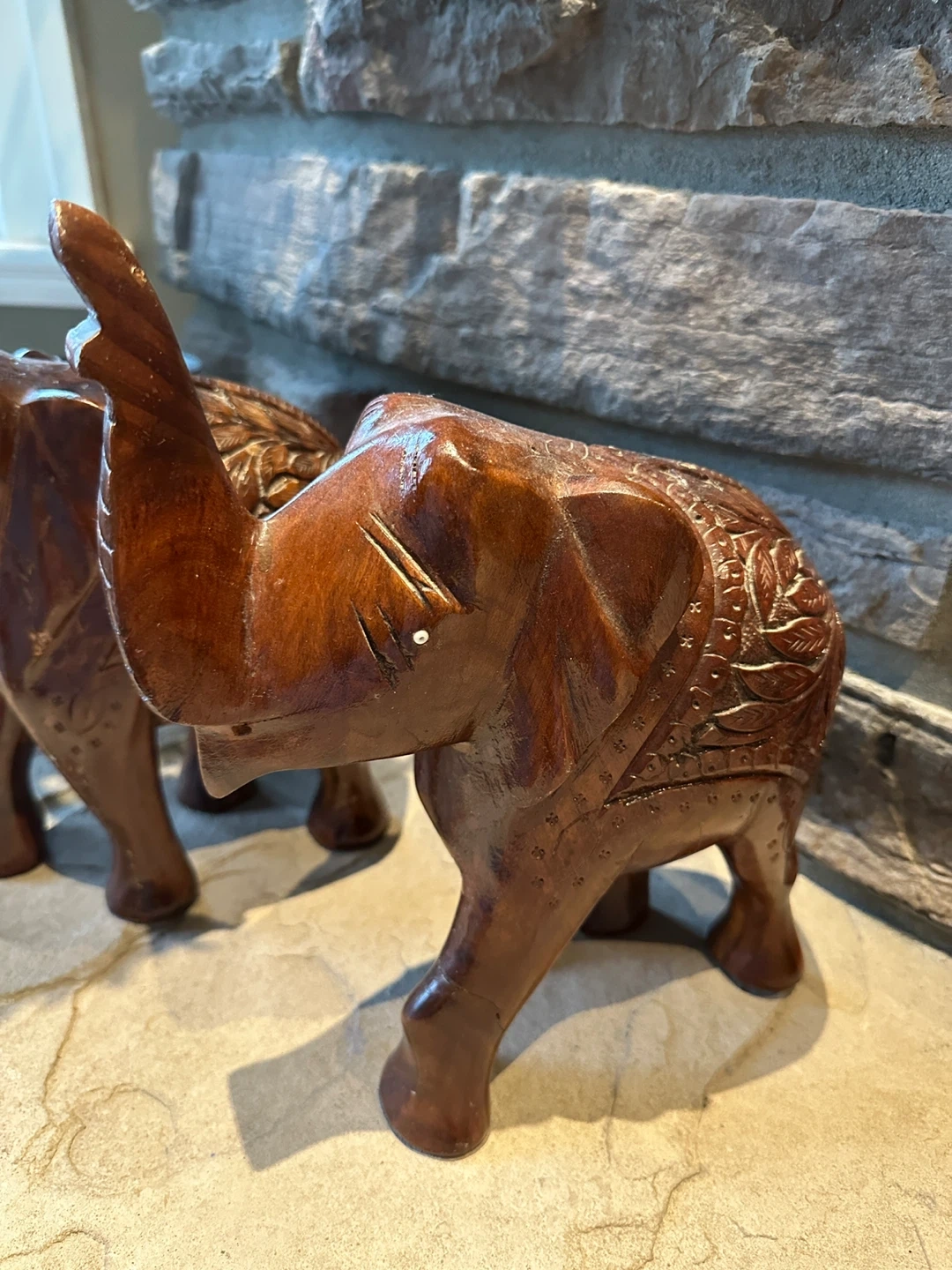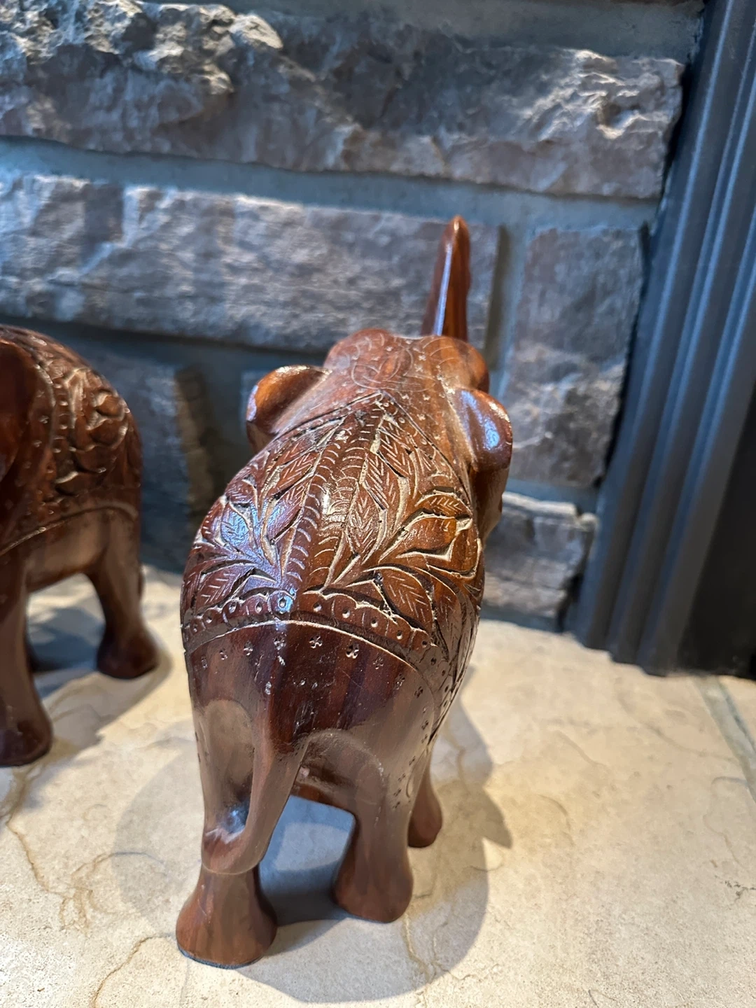 A pair of intricately hand carved wooden elephants with a rich, dark wood finish. They display detailed patterns on their backs and are finished with a glossy sheen. These decorative pieces add a touch of elegance to any room.