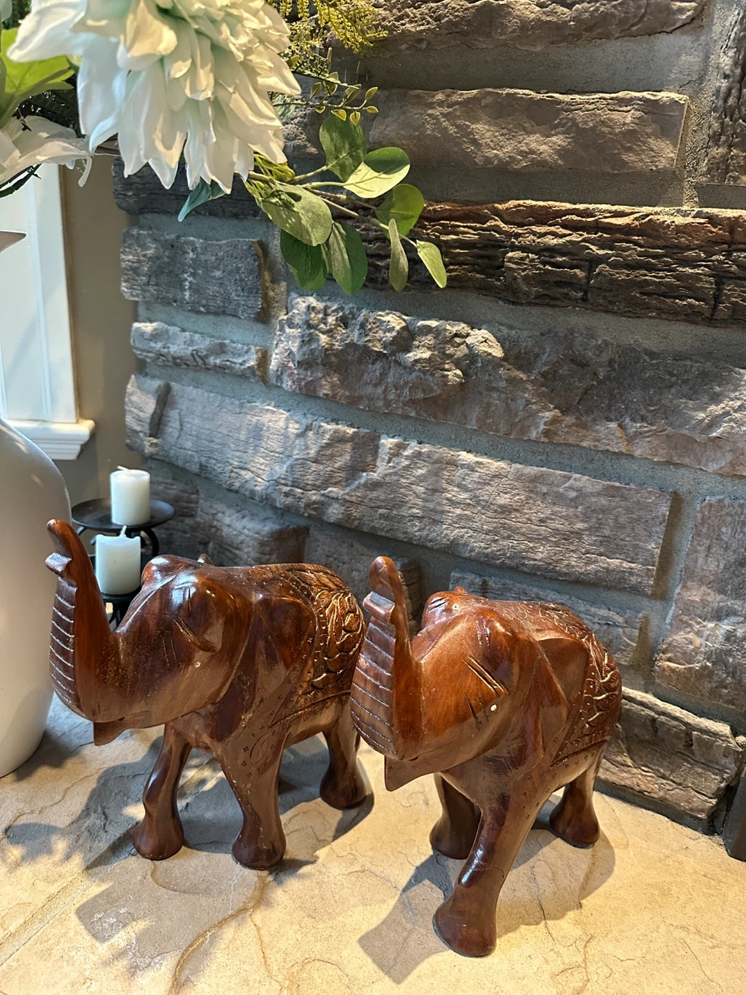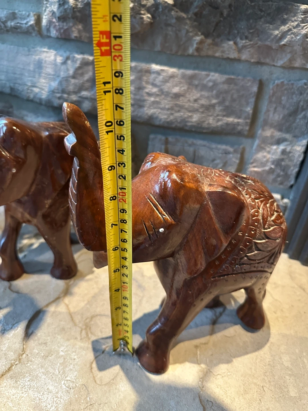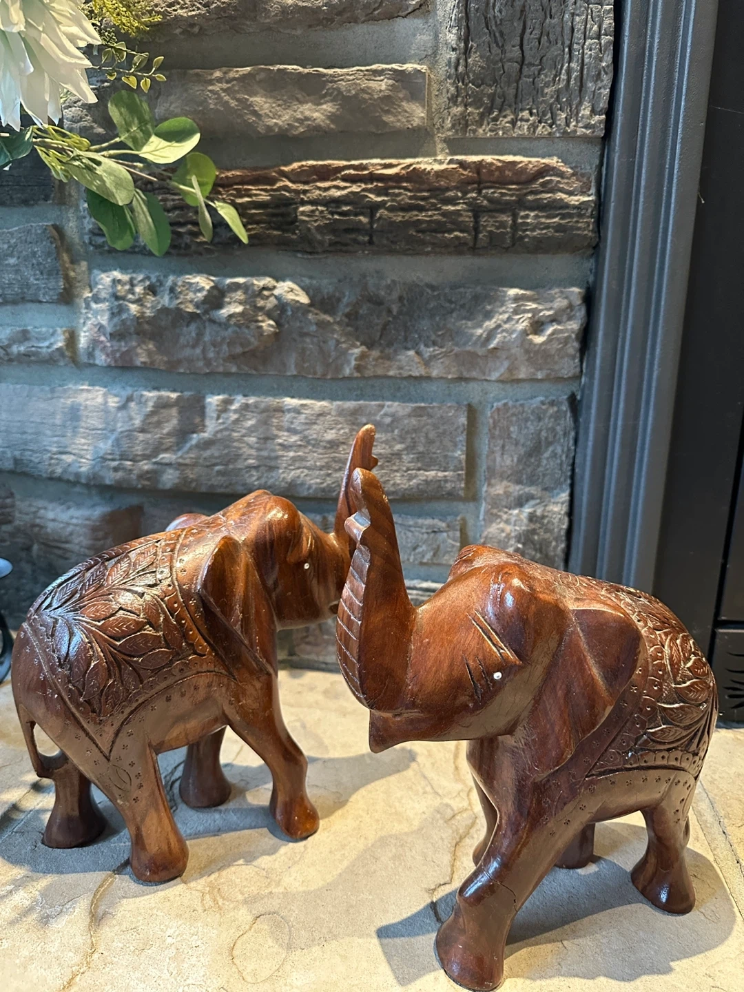 A pair of intricately hand carved wooden elephants with a rich, dark wood finish. They display detailed patterns on their backs and are finished with a glossy sheen. These decorative pieces add a touch of elegance to any room.