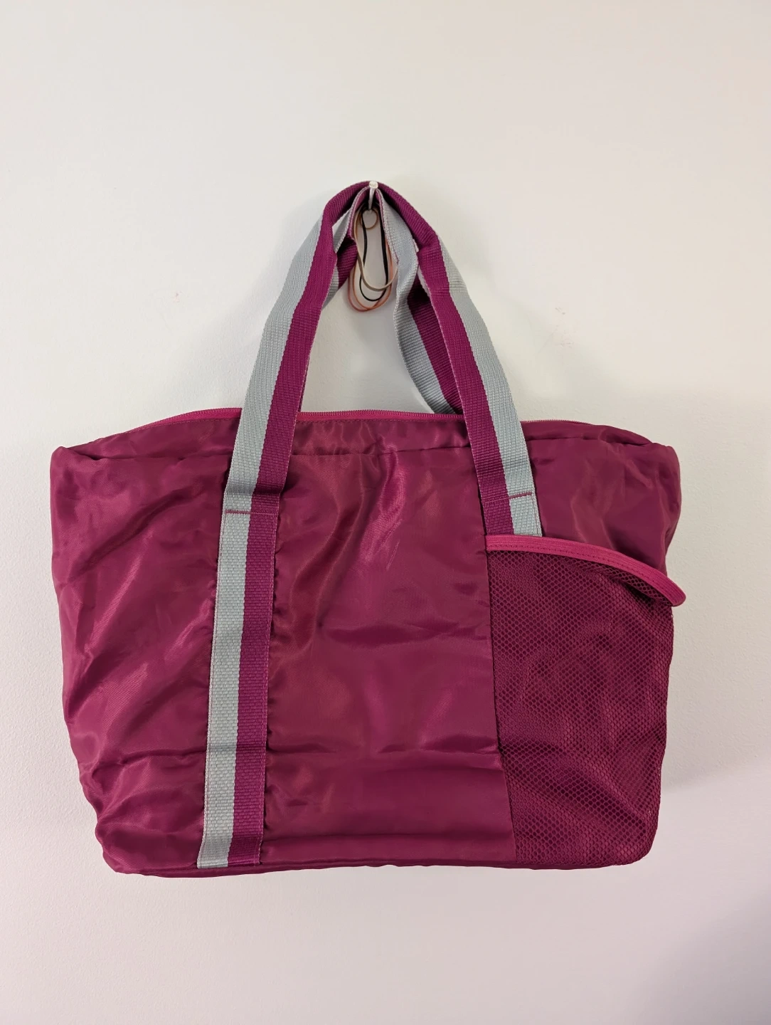 This Skechers vintage tote bag is a vibrant pink color. It features a mesh front pocket with the Skechers logo. The interior has multiple pockets for organization. It's perfect for everyday use or for carrying gym essentials!