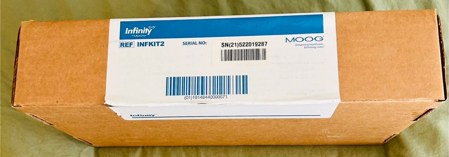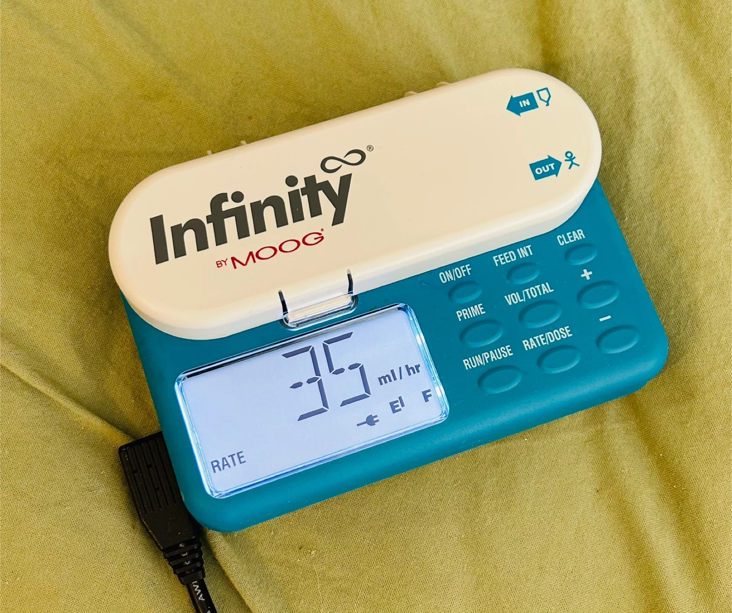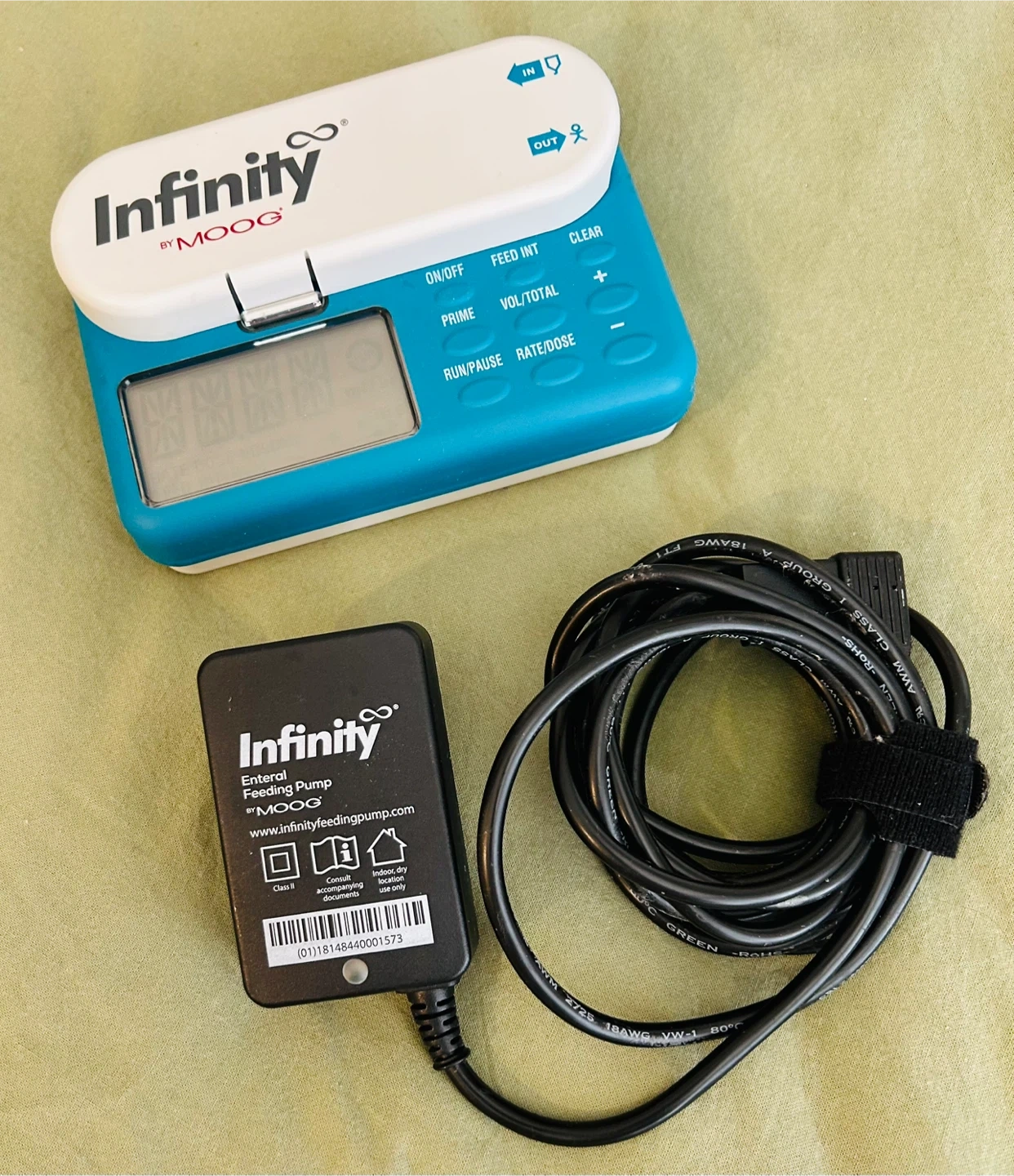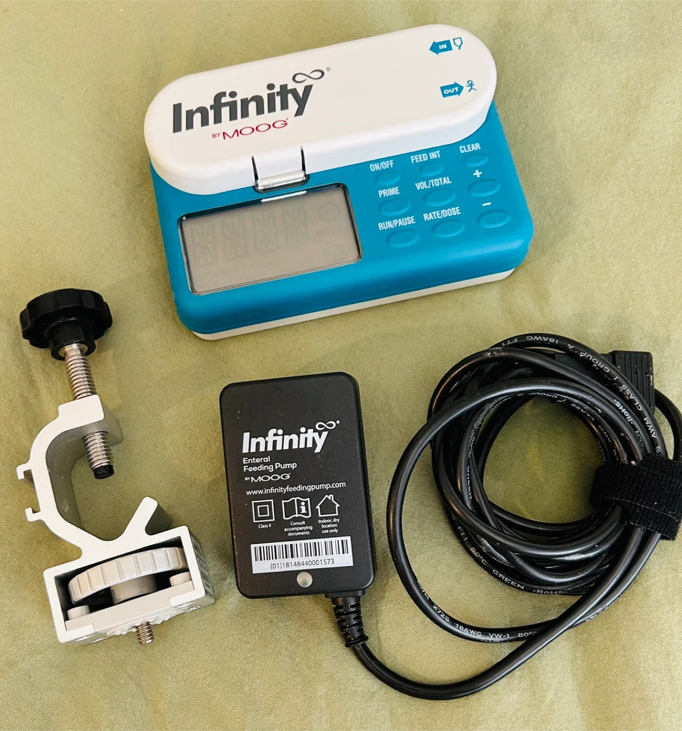 This is an Infinity Enteral Feeding Pump by Moog. It's a portable device for administering liquid nutrition. Includes the pump, power adapter, and operator's manual.
