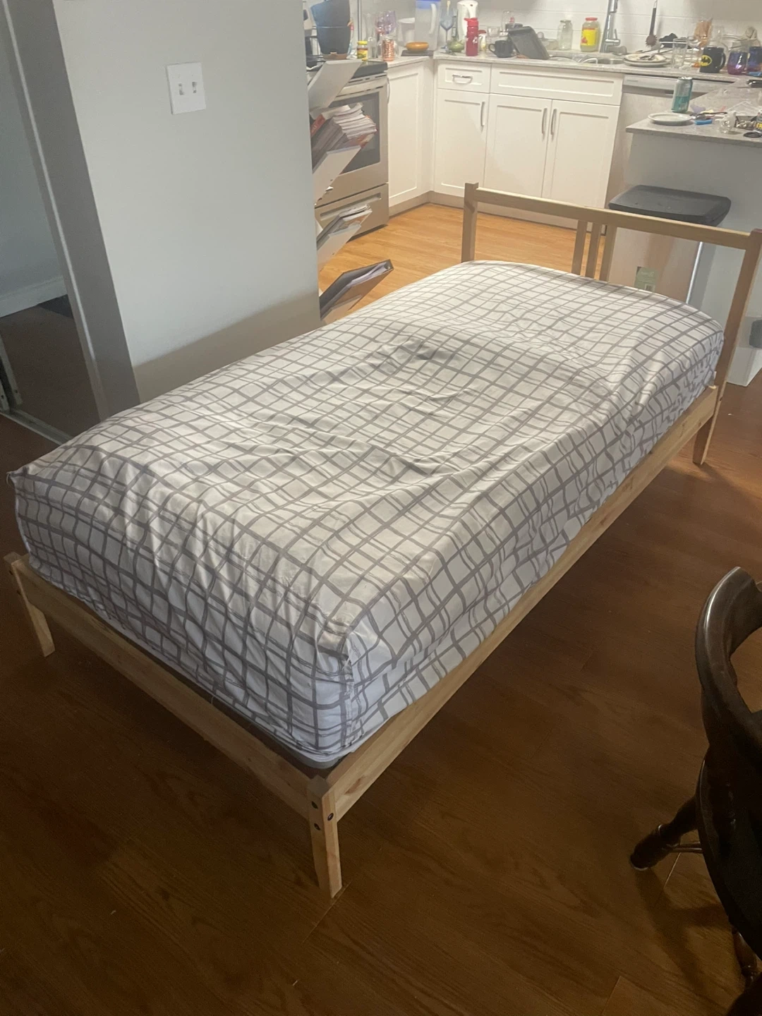 This is a single bed frame made of wood. It has a simple, slatted design. It's great for a starter home or a guest room. Comes with a single size mattress, a bed comforter layer, waterproof/leakproof bedsheet and regular fitted bed sheet. Can disassemble bed frame for pick up