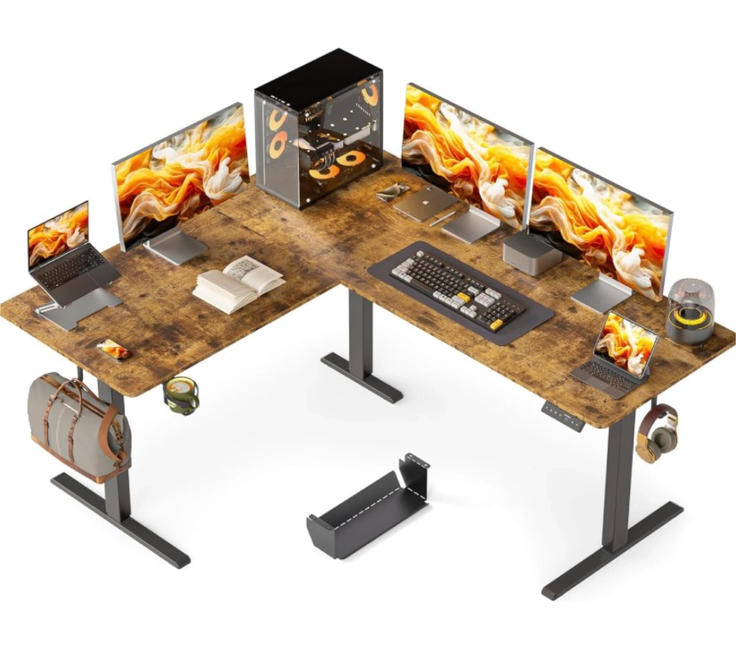 Standing desk in REVERSIBLE L shape, 63x55 inches. Comes with a cup holder, cable management box. Goes as high as 46.5 & as low as 28.3.