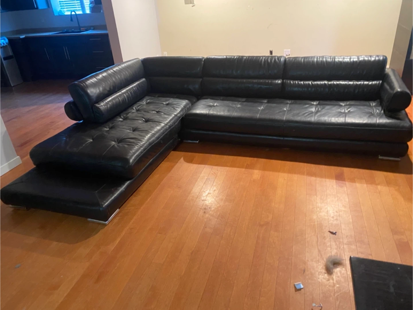 This is a scan design black leather sectional sofa with tufted seats and chrome legs. It offers ample seating space and a modern look for your living area.