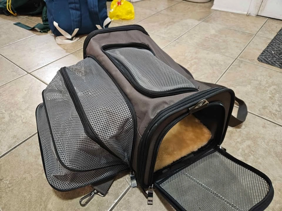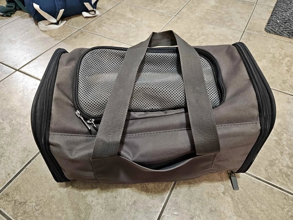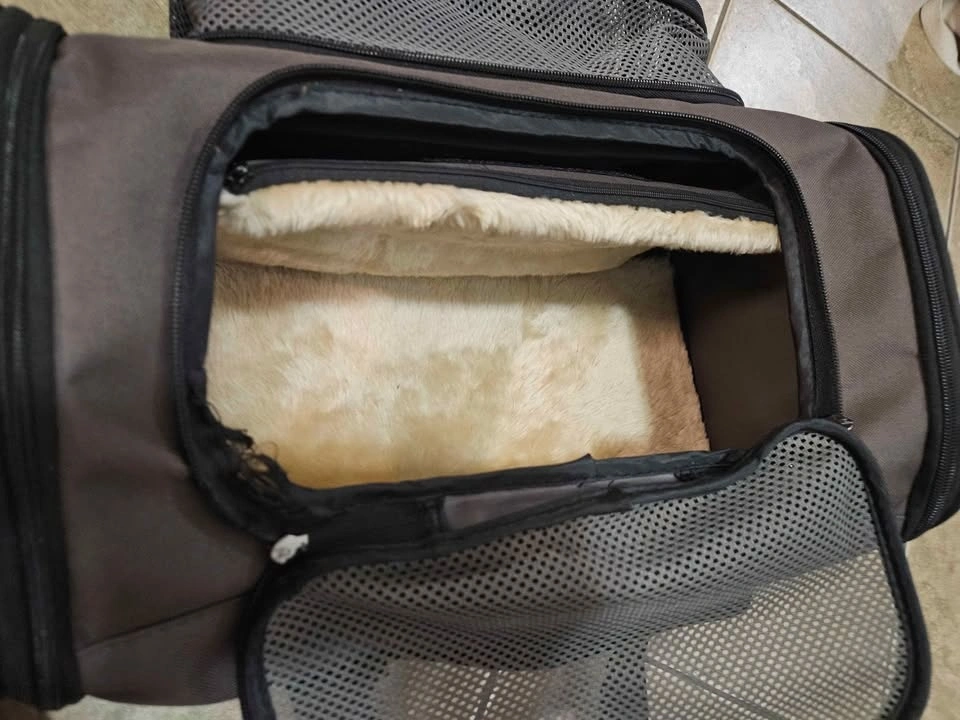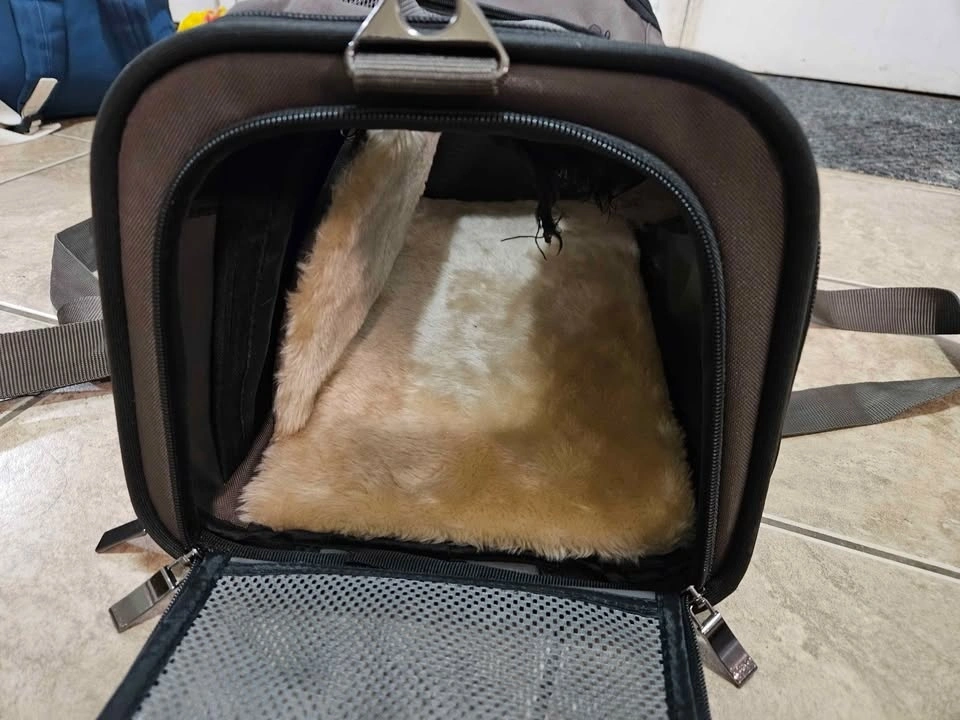 Soft pet carrier for airplane with great features. Fits underneath the seat. The only teared part is included in the photos, but no effect on functionality. Dimensions: Width 40.5cm, Length 25.5cm, Height 23.5cm. Weight: 1kg. Pickup available at St. Clair West, St. George, or North York Centre stations depending on the day.