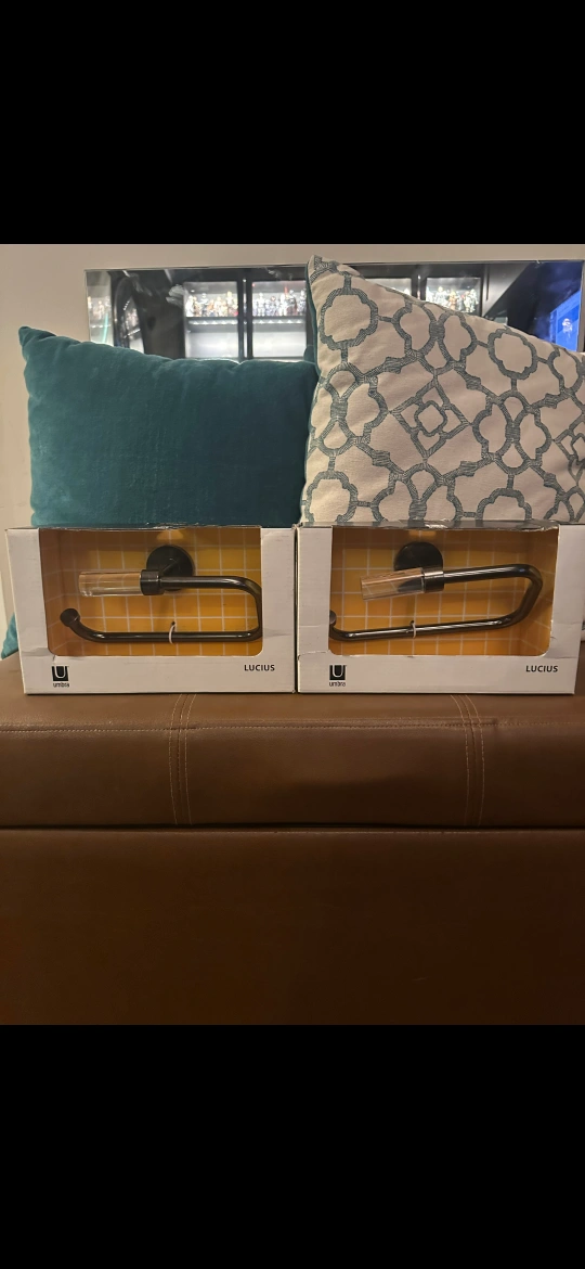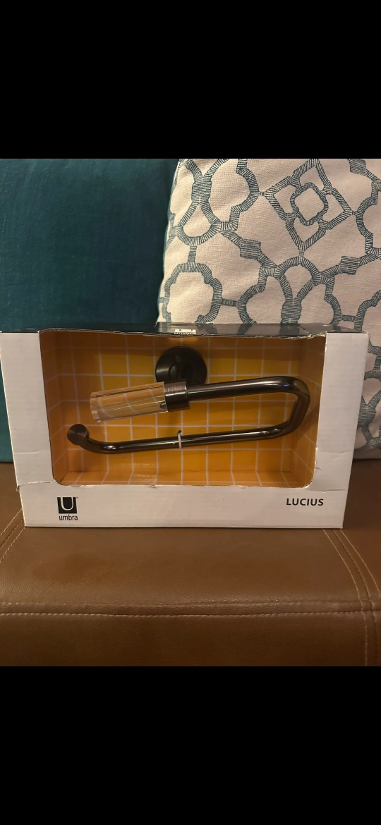 Keep your bathroom organized with this sleek, new Umbra Lucius toilet paper holder, featuring a modern black metal finish and a unique wood accent. It's designed for easy wall mounting, blending functionality with contemporary style.