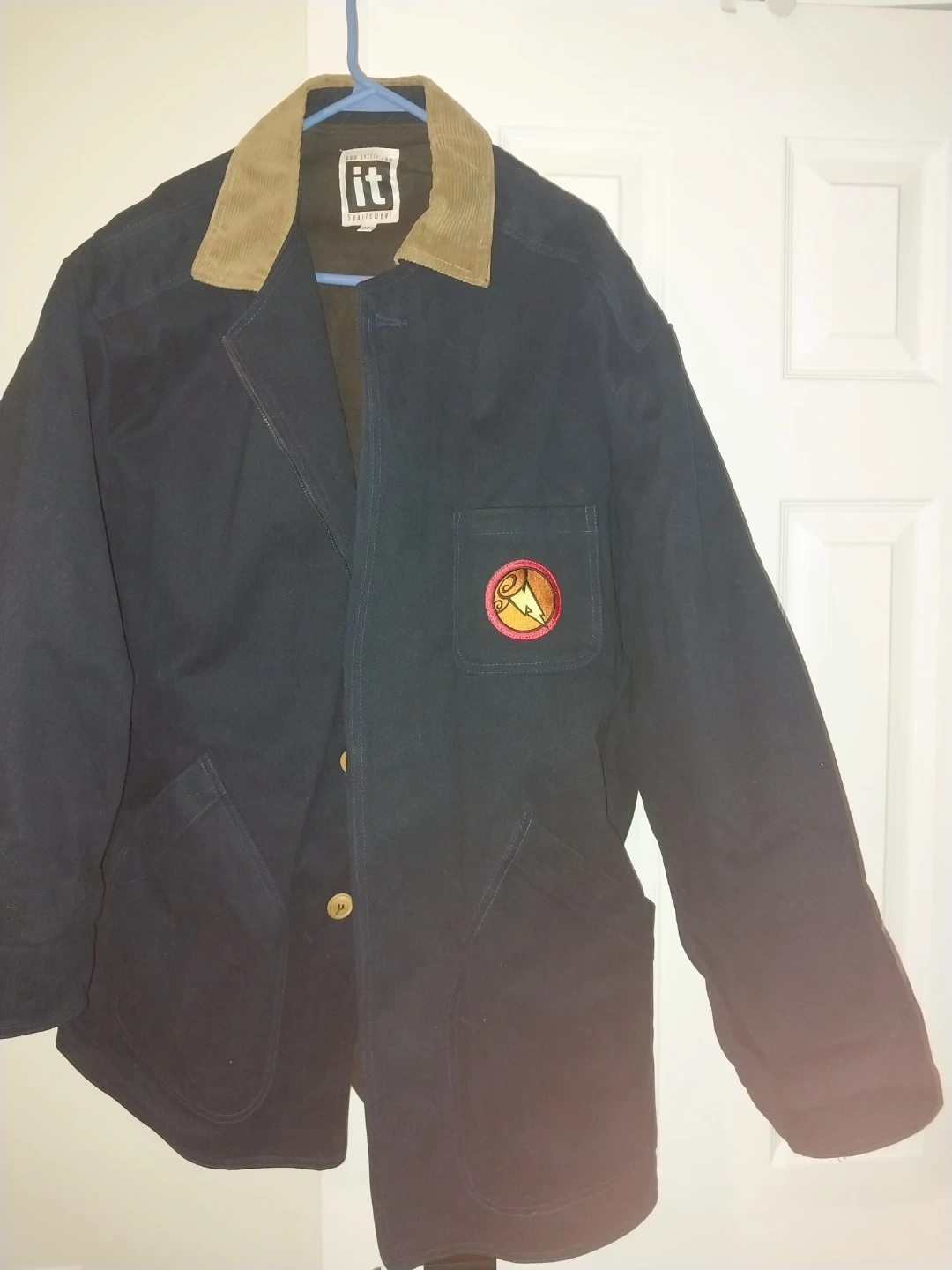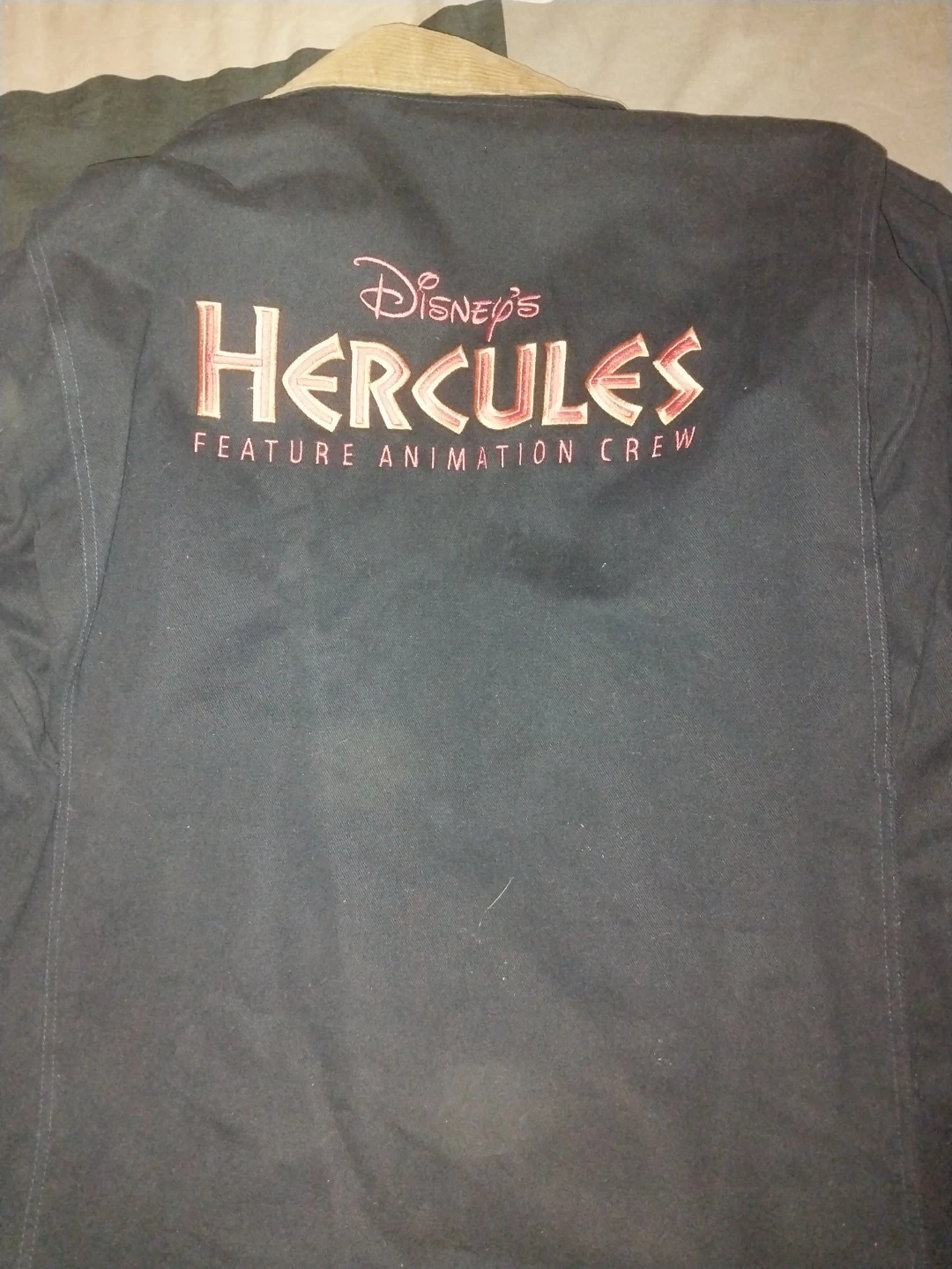 This dark navy jacket is from Disney's Hercules Feature Animation Crew. It has a corduroy collar and embroidered details. Size medium.