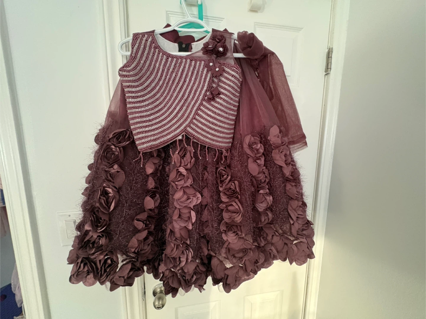 This gorgeous set features a richly embellished bodice with beads and sequins, paired with a voluminous tulle skirt adorned with 3D floral appliques. It's a stunning outfit perfect for special occasions. The skirt has a satin waistband and layered tulle for a full look.