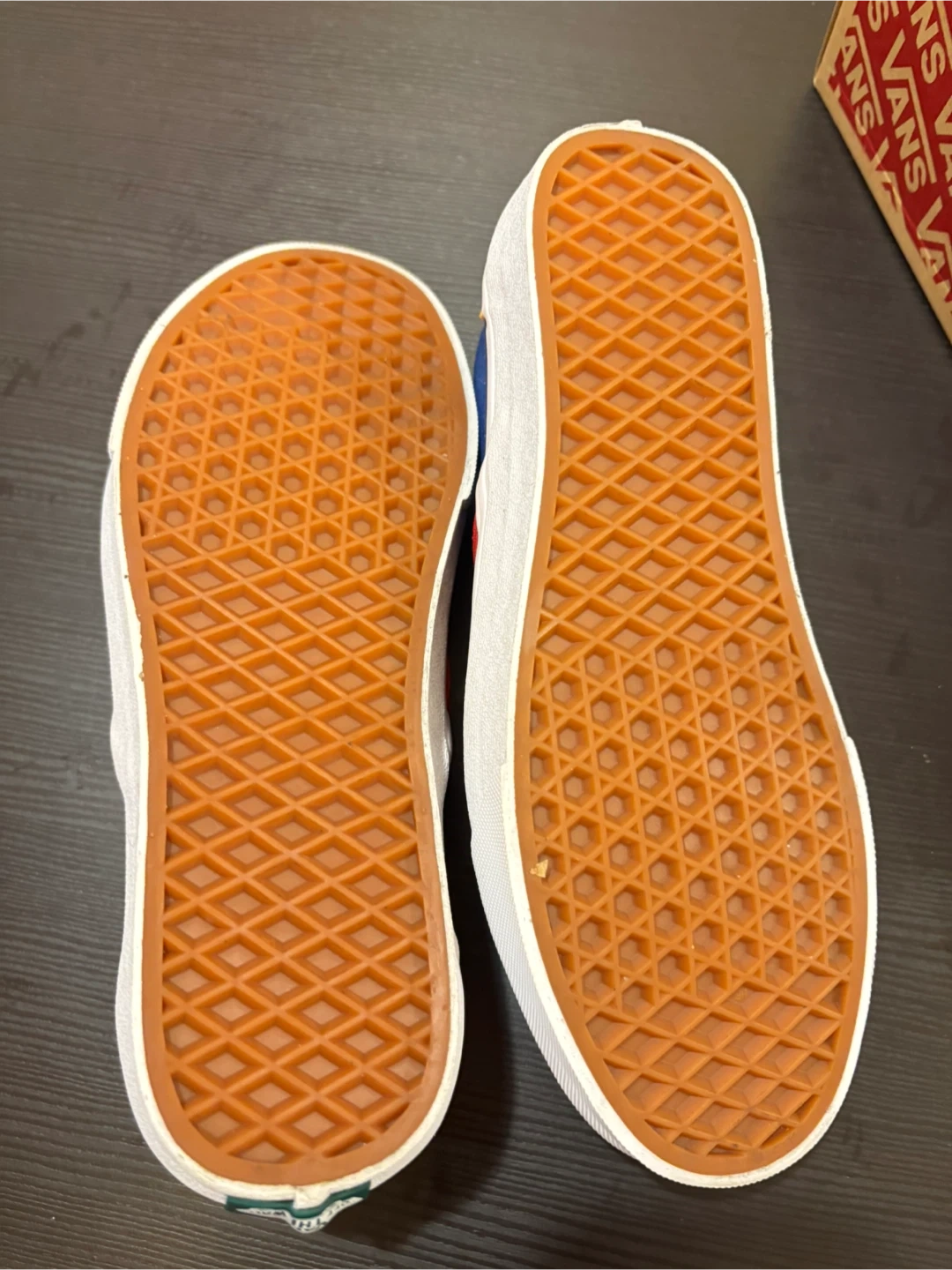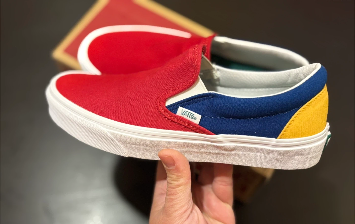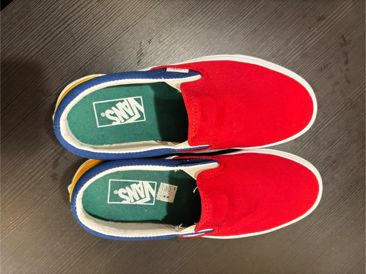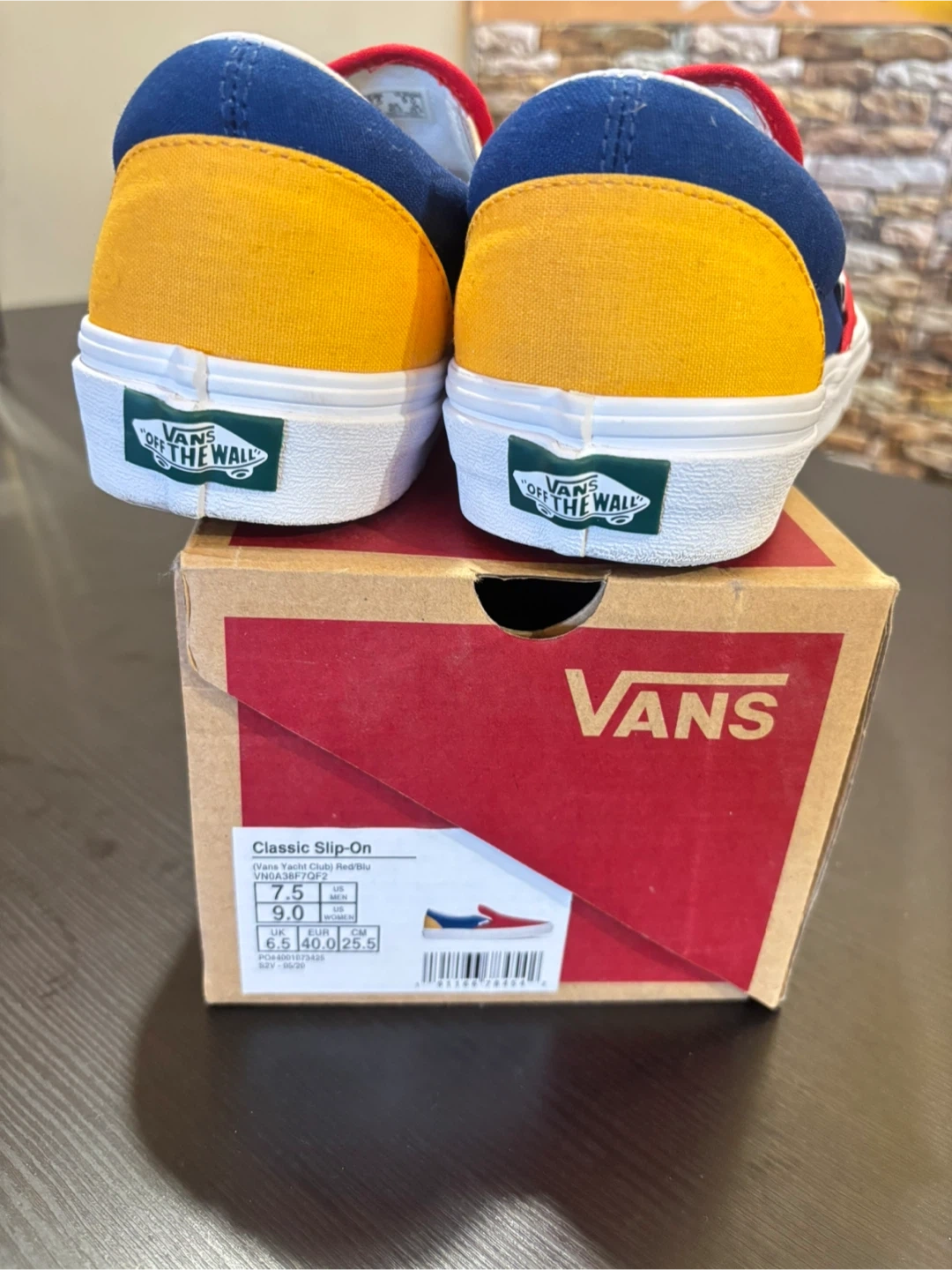 These are Vans Classic Slip-On sneakers in a red, blue, and yellow colourway. They come with the original box. This style is great for everyday wear!