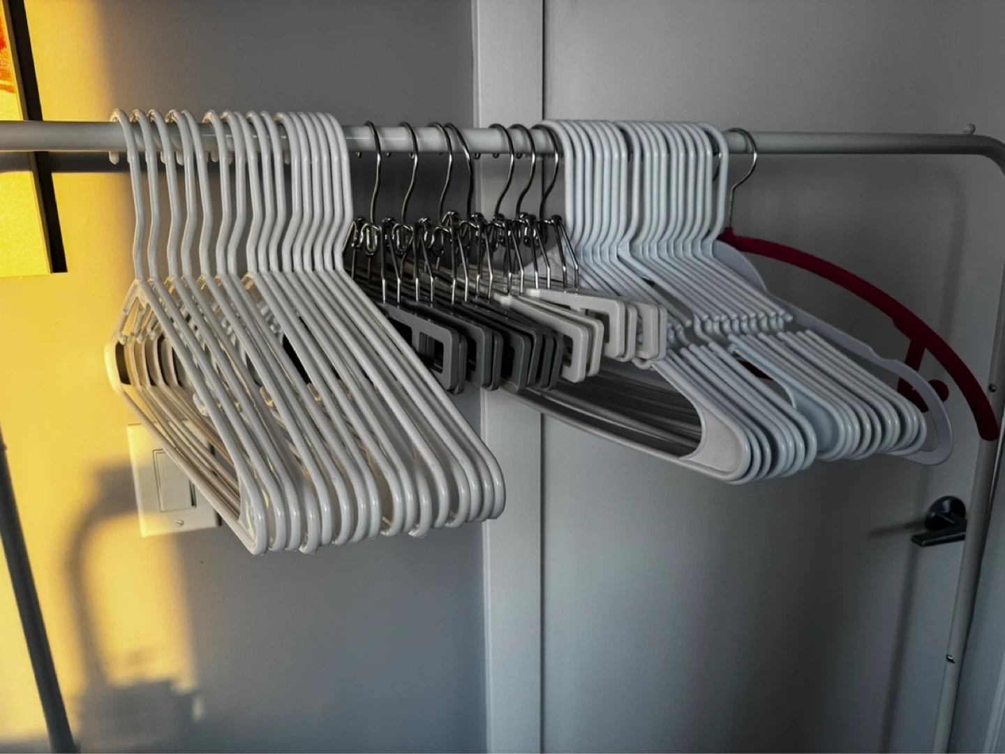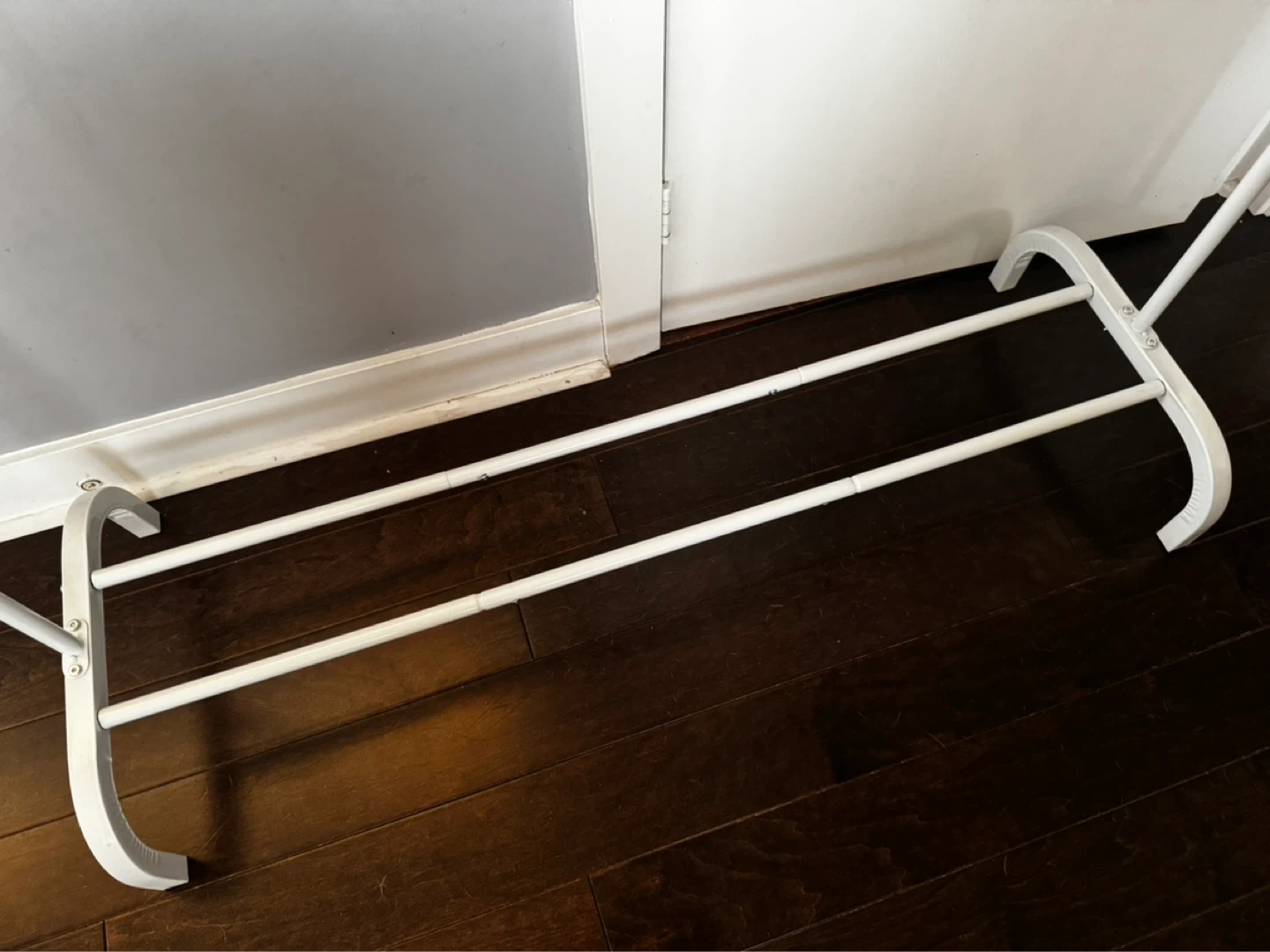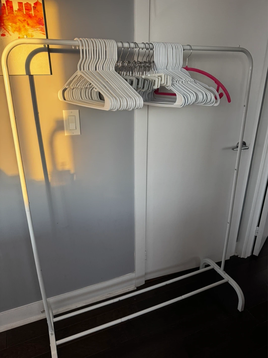I purchased this clothing rack from Karrot. I find it a little wobbly but maybe I didn’t tighten the screws enough. It still does the job. I got rid of a lot of my clothes so I don’t need it anymore. I’m including the hangers as shown.