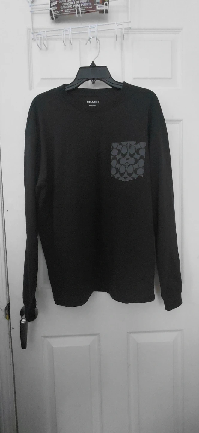 This is a black long-sleeved t-shirt from COACH. It features a grey signature print pattern on the chest pocket. The material is soft and comfortable.