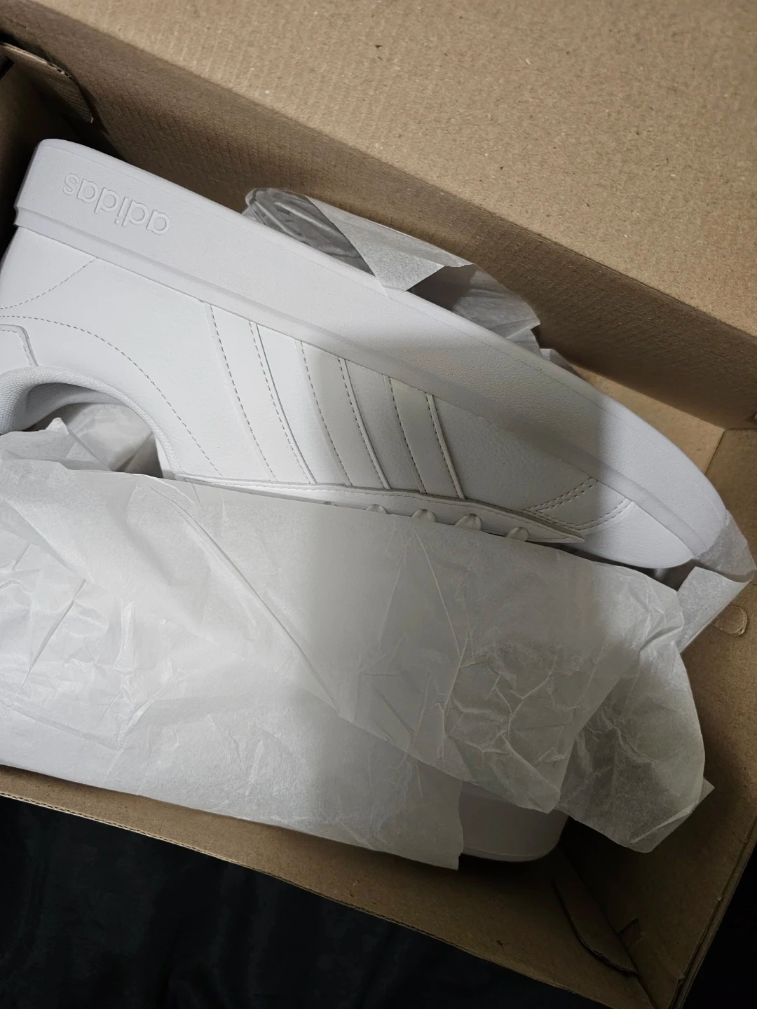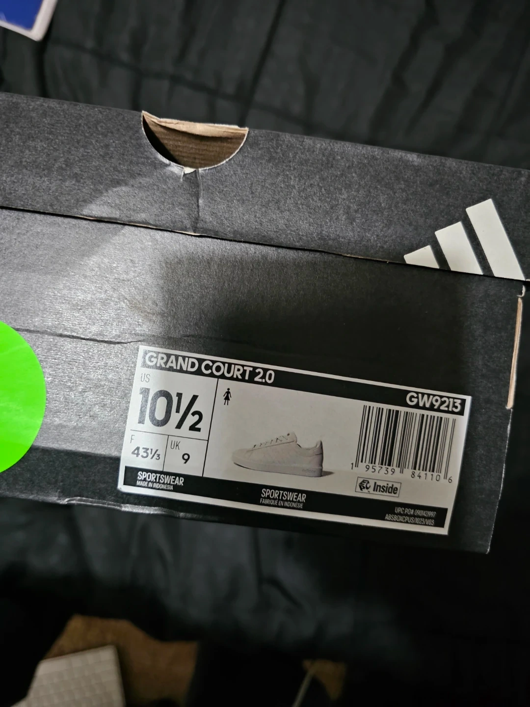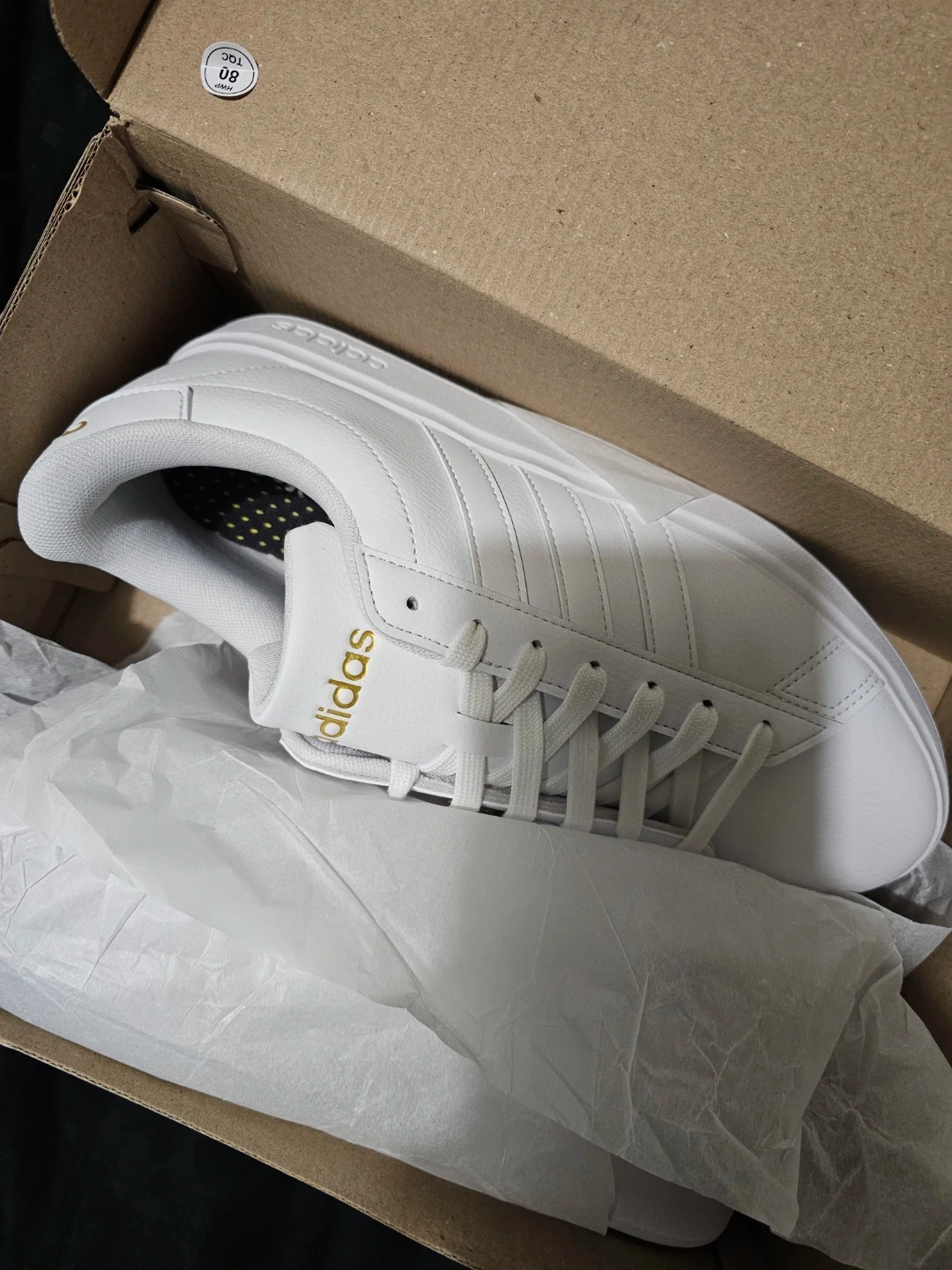 These are womens Adidas Grand Court 2.0 sneakers in white with gold accents. They're a size 10.5 US. Includes original box. Perfect for everyday wear!