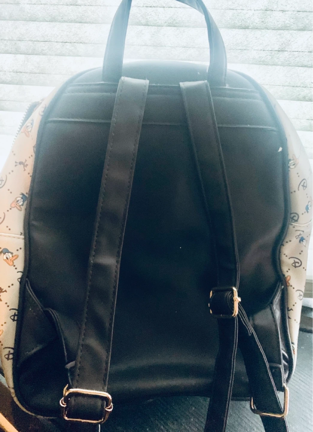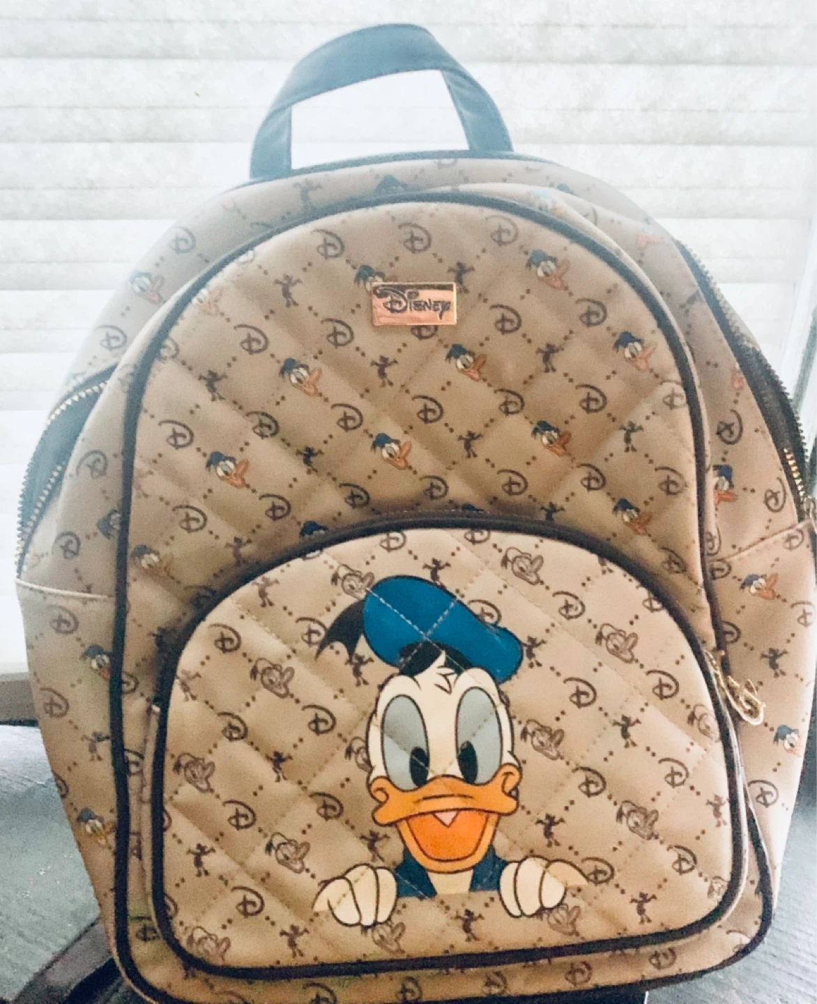 Quilted mini backpack featuring Donald Duck. It's made with faux leather. Perfect for Disney fans!