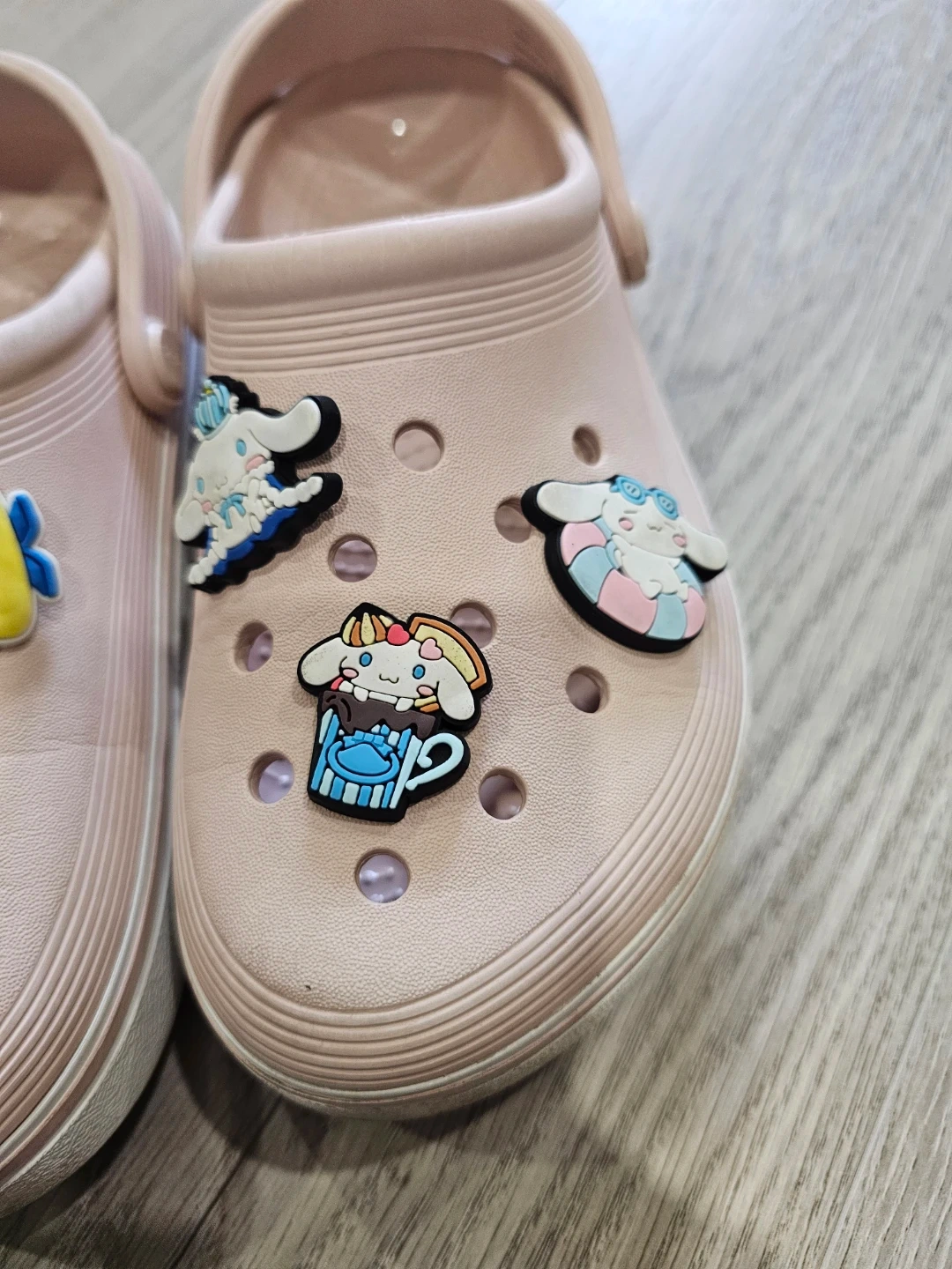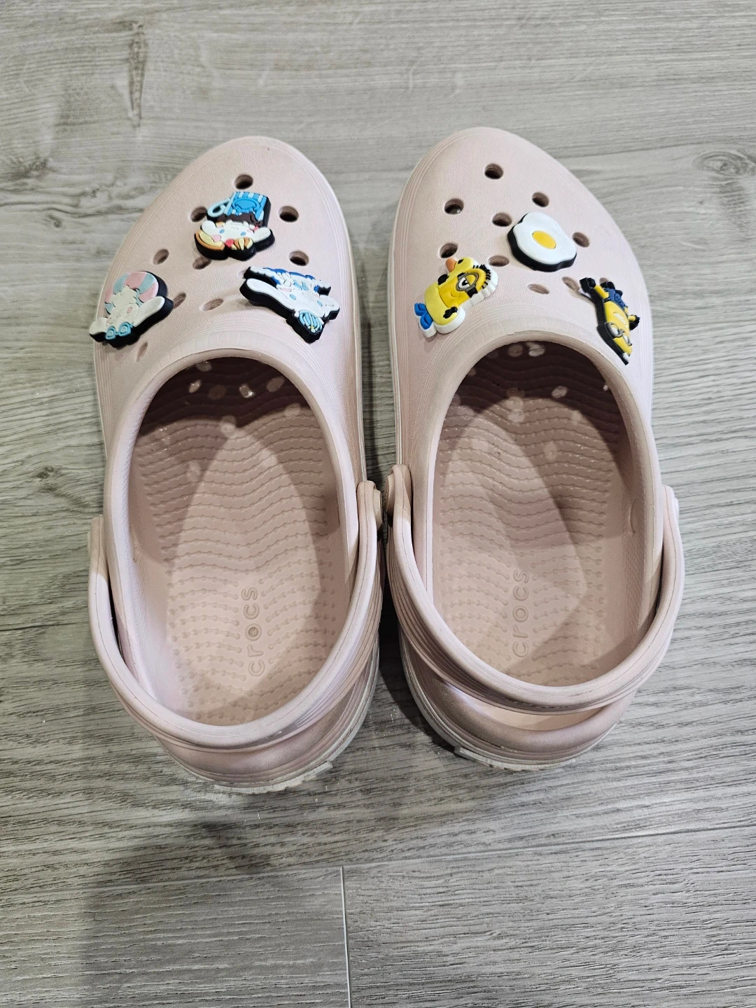 Pink Crocs clogs decorated with various colourful charms, including Minions and Cinnamoroll. These comfy slip-on shoes are perfect for casual wear. They're made from a durable, lightweight material. Easy to clean and wear!