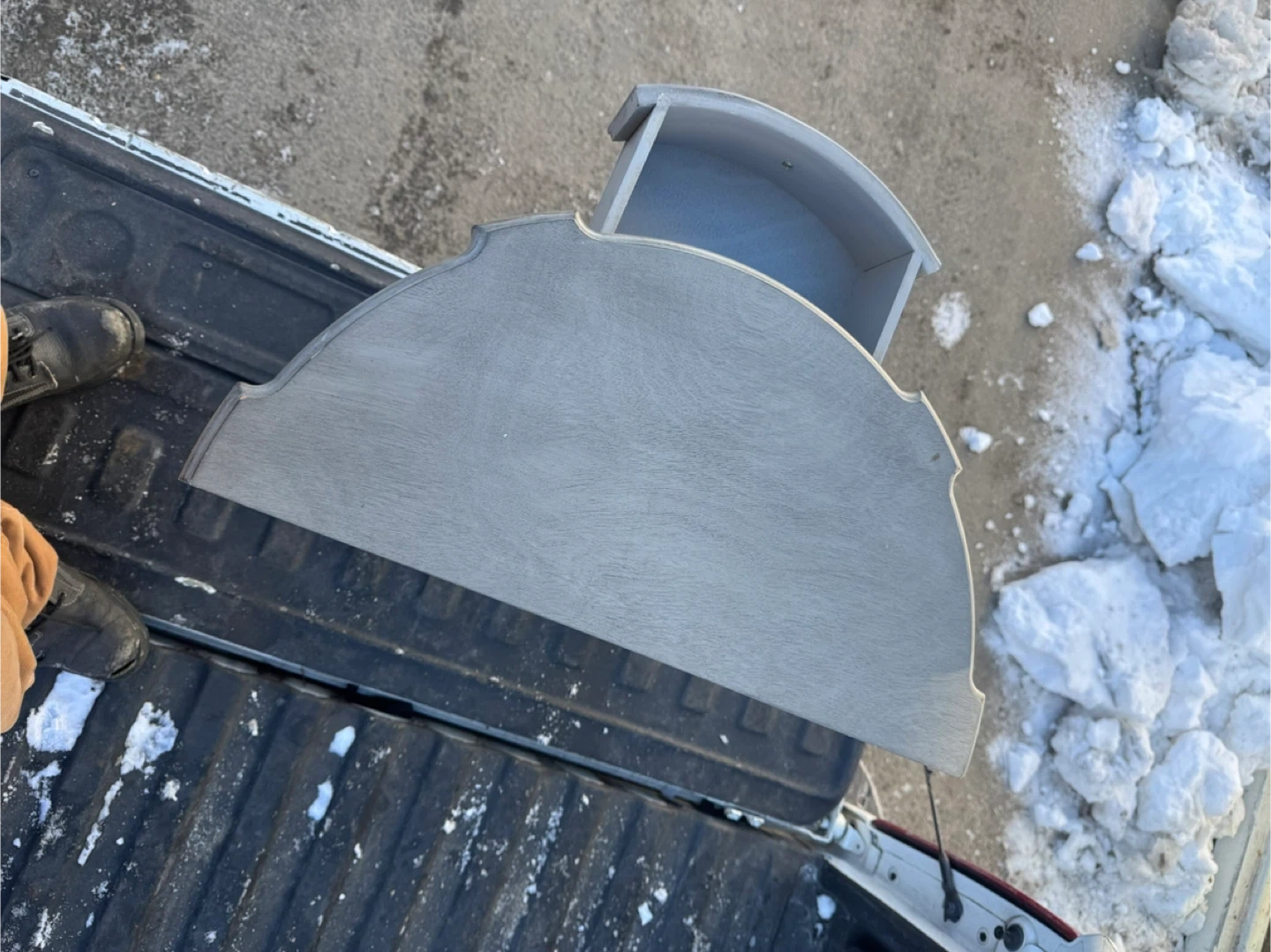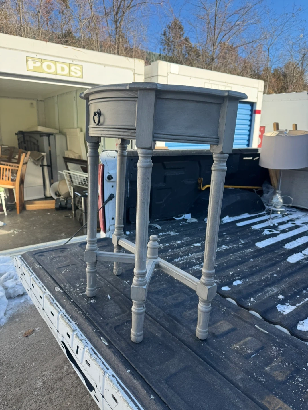 Gray accent table featuring a curved top and a single drawer with a metal pull. Legs are carved with decorative details.