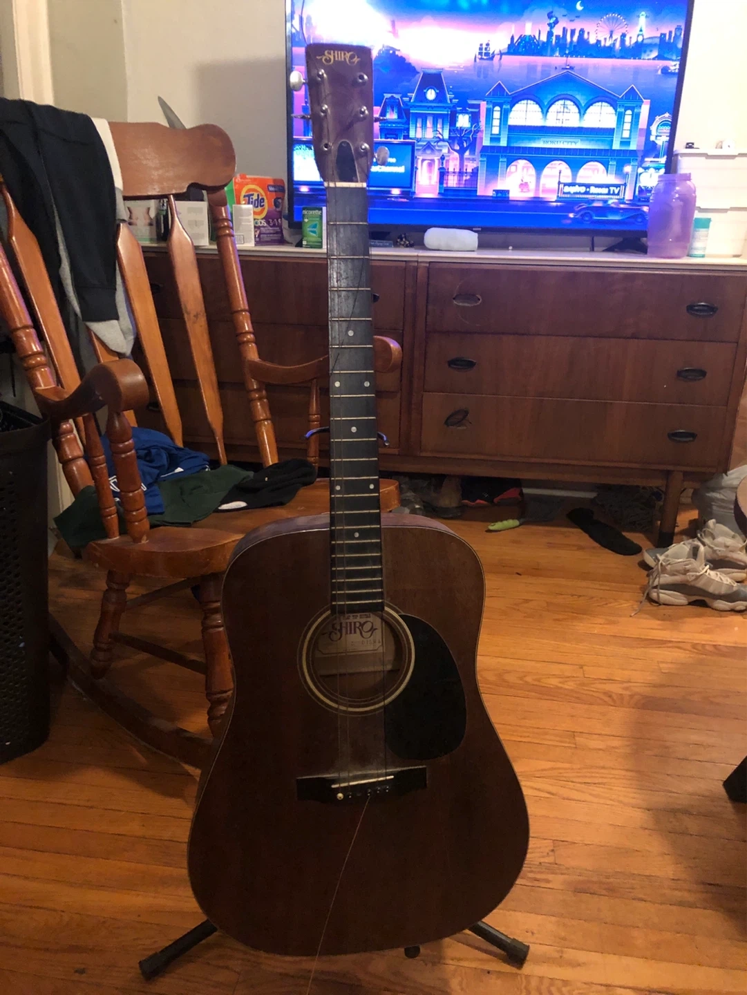 This is an acoustic guitar. It has a wooden body and strings. It's suitable for learning to play music. This guitar would be great for aspiring musicians. Needs a few repairs but does sound amazing