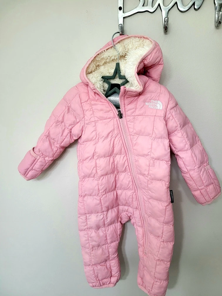A cozy and warm pink baby snowsuit (3- 6 months) from The North Face! It's perfect for keeping your little one snug during those cold winter days. The suit features a soft, plush lining in the hood for extra comfort.