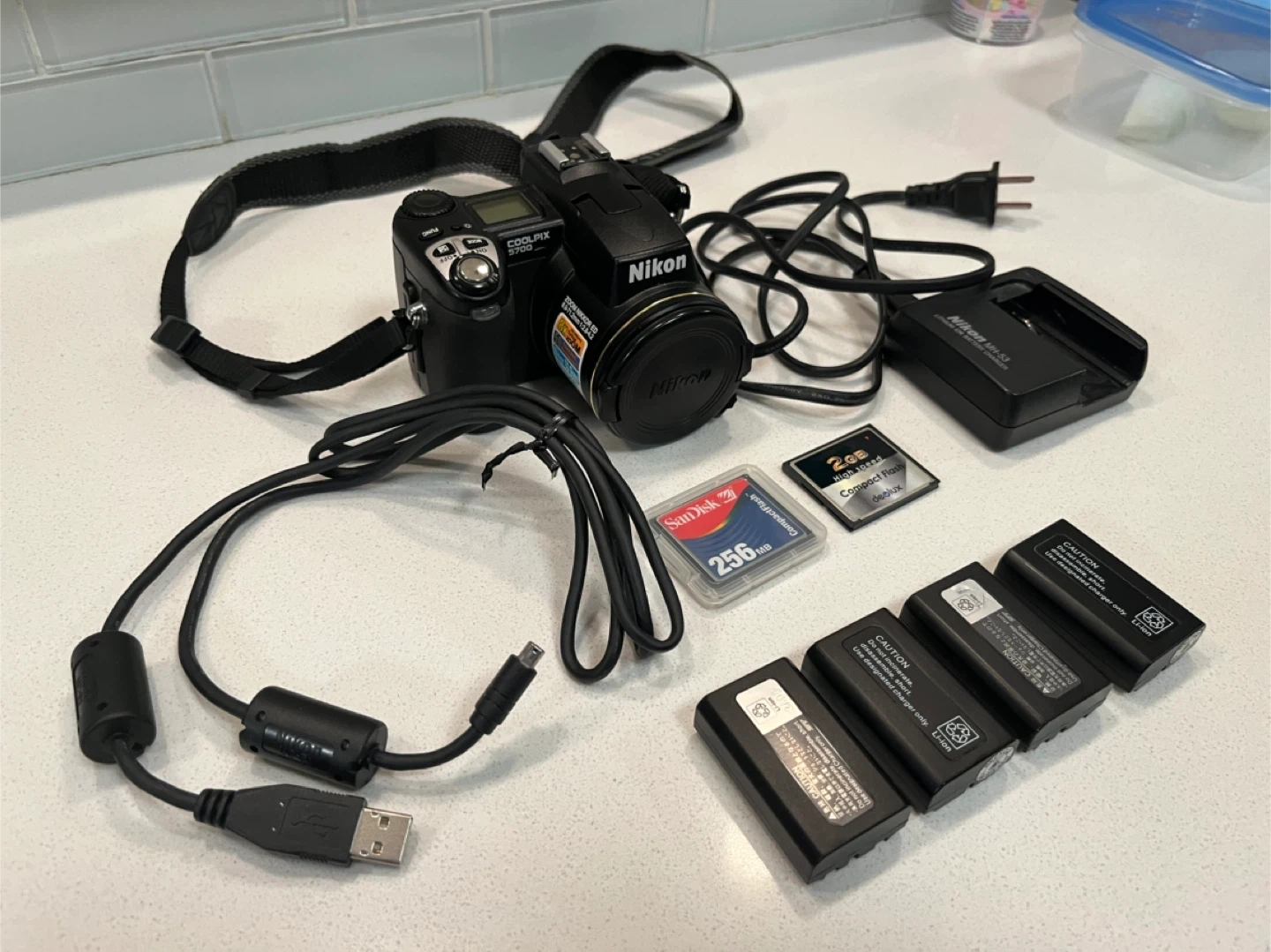 This Nikon Coolpix 5700 digital camera comes with a charger, multiple batteries, a 256MB CompactFlash card, and a 2GB CompactFlash card. It's a complete package for capturing your moments!