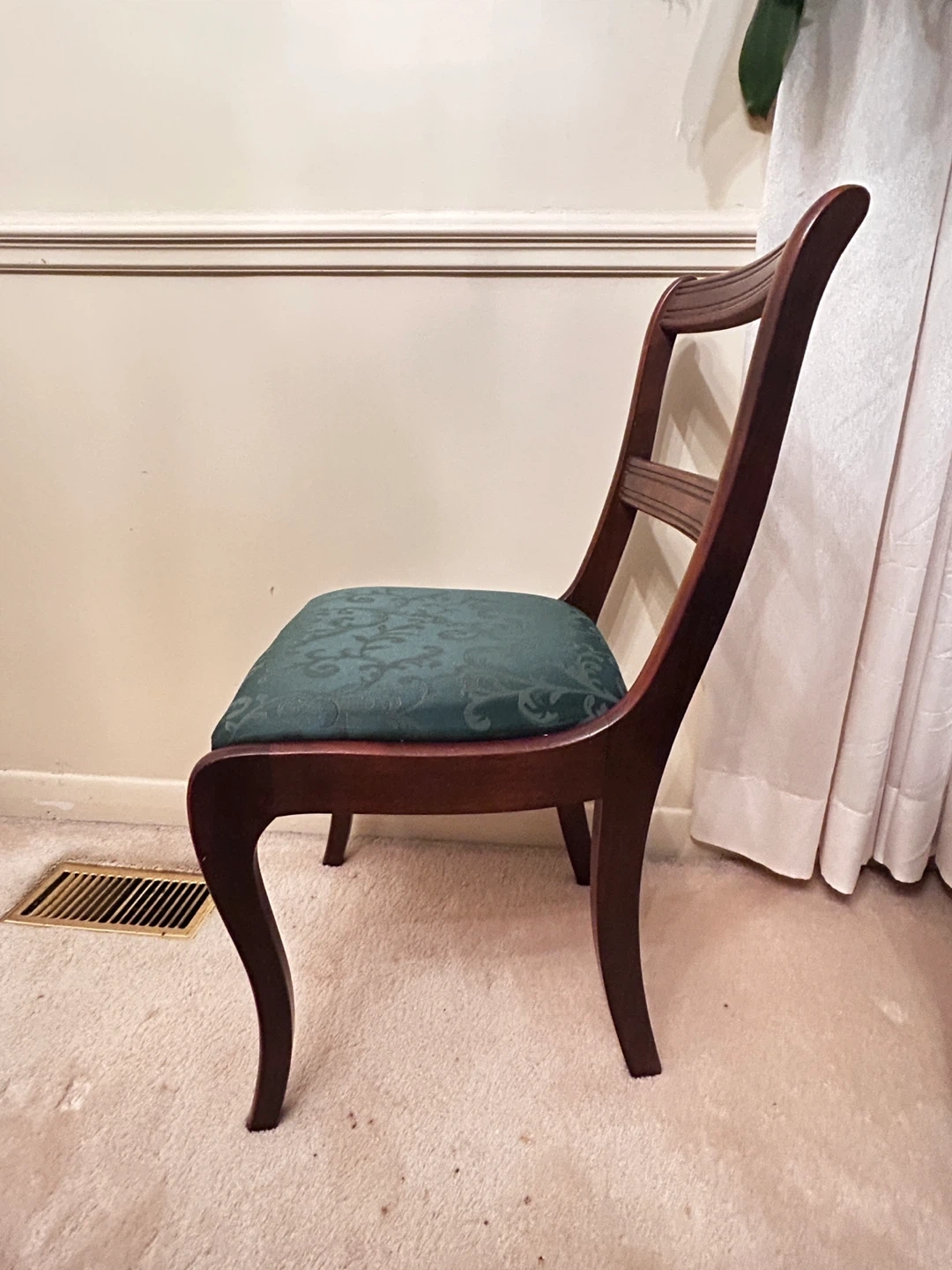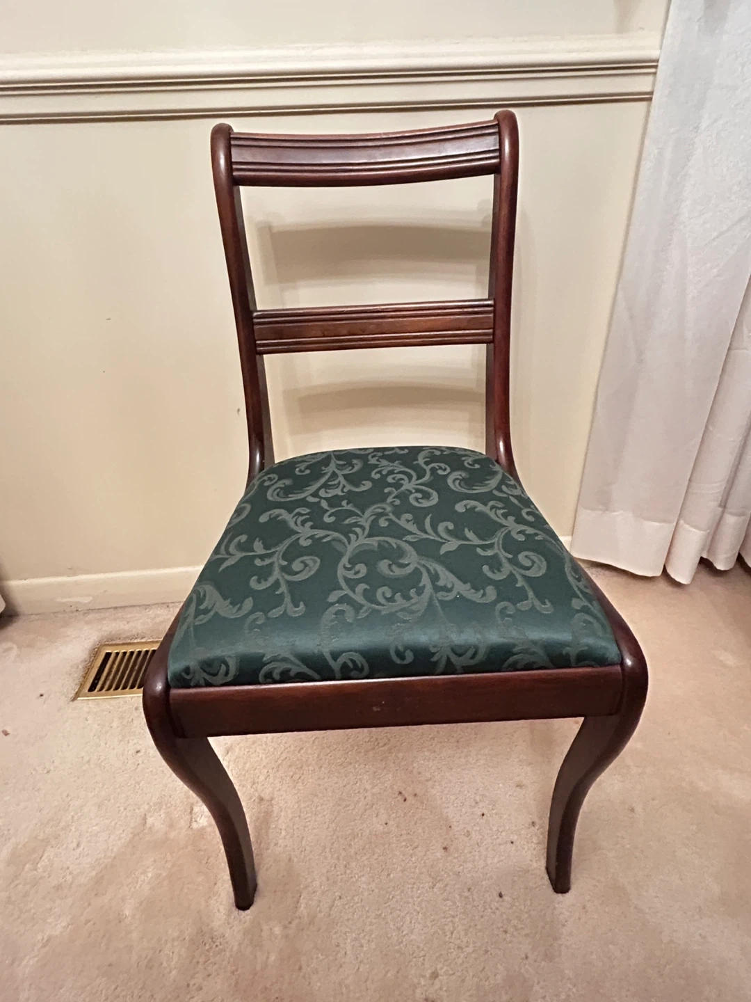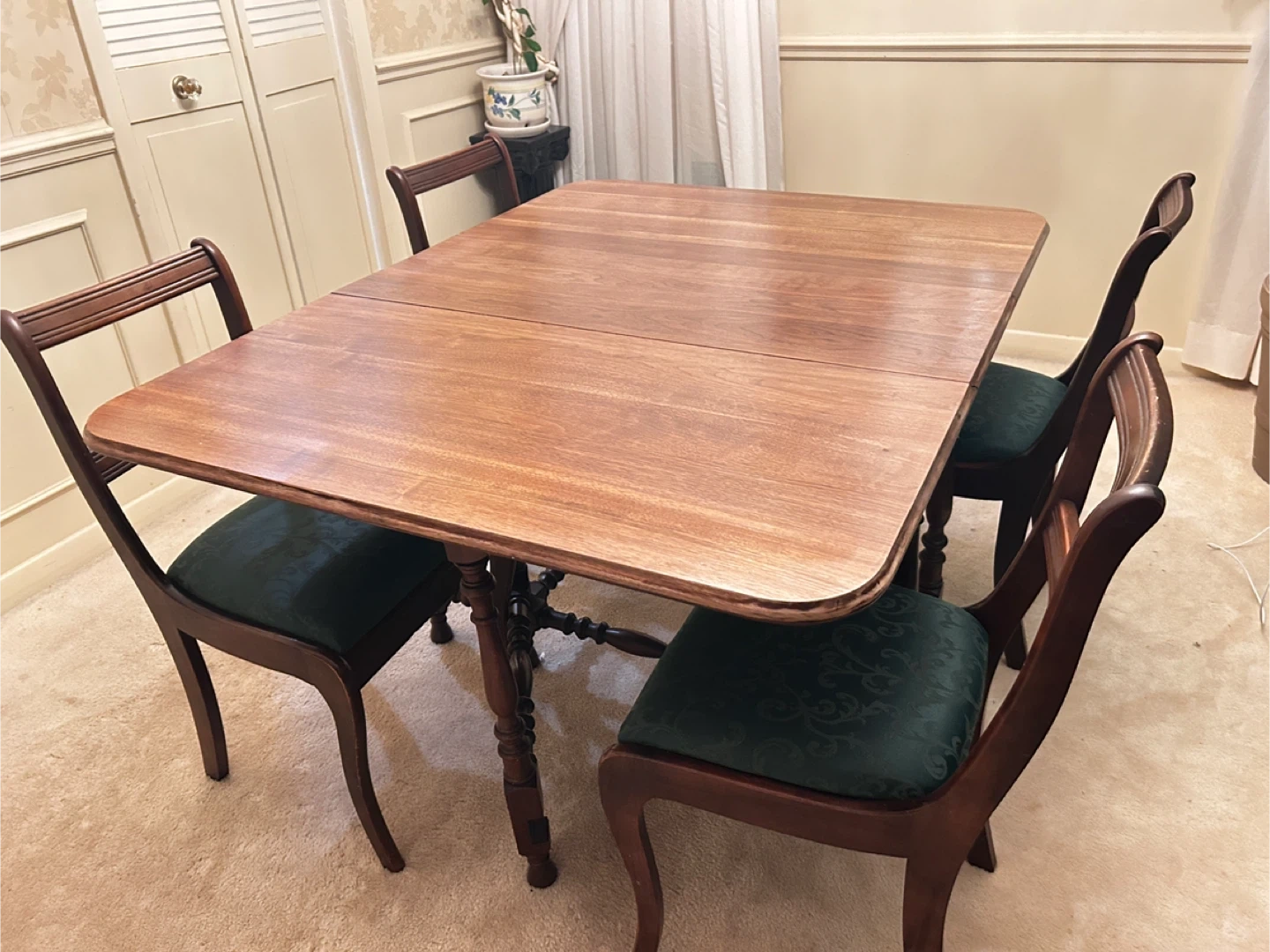 Selling a beautiful antique wood dining table that comes with four matching chairs. The table can be folded down on both sides to make space when not needed. Table size: 40” x 53”. Folded: 40” x 13”. The chairs have green patterned cushions and a classic style. Which are in great condition, but can easily be recovered. A great set to add some vintage charm to your dining room!