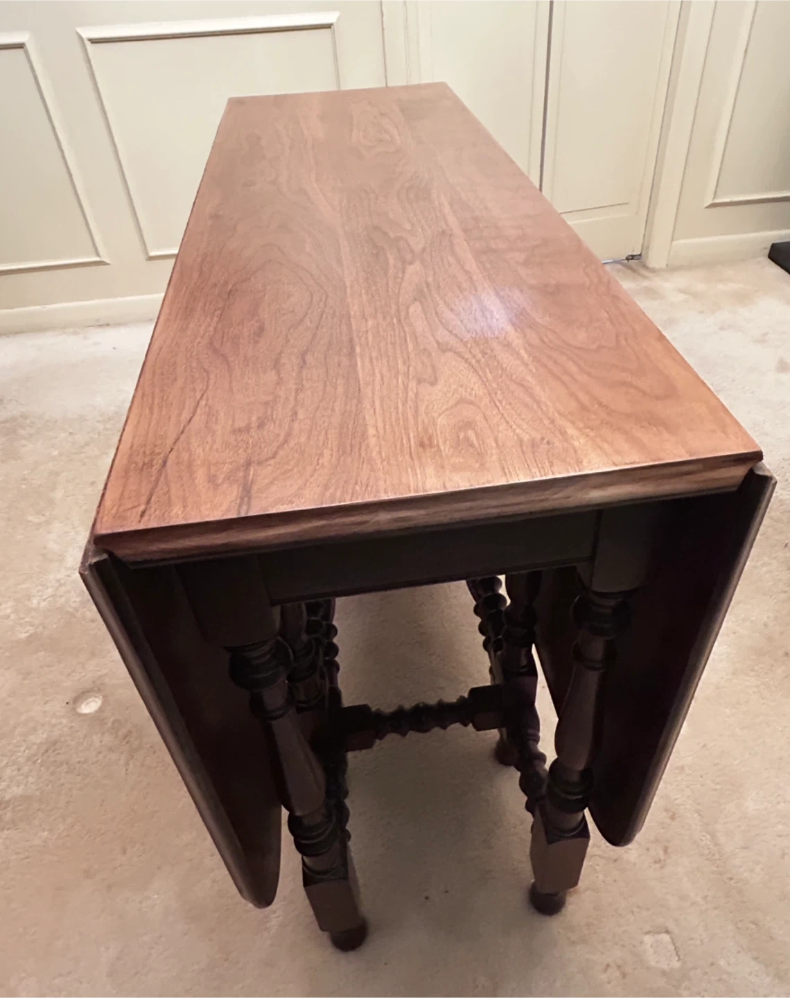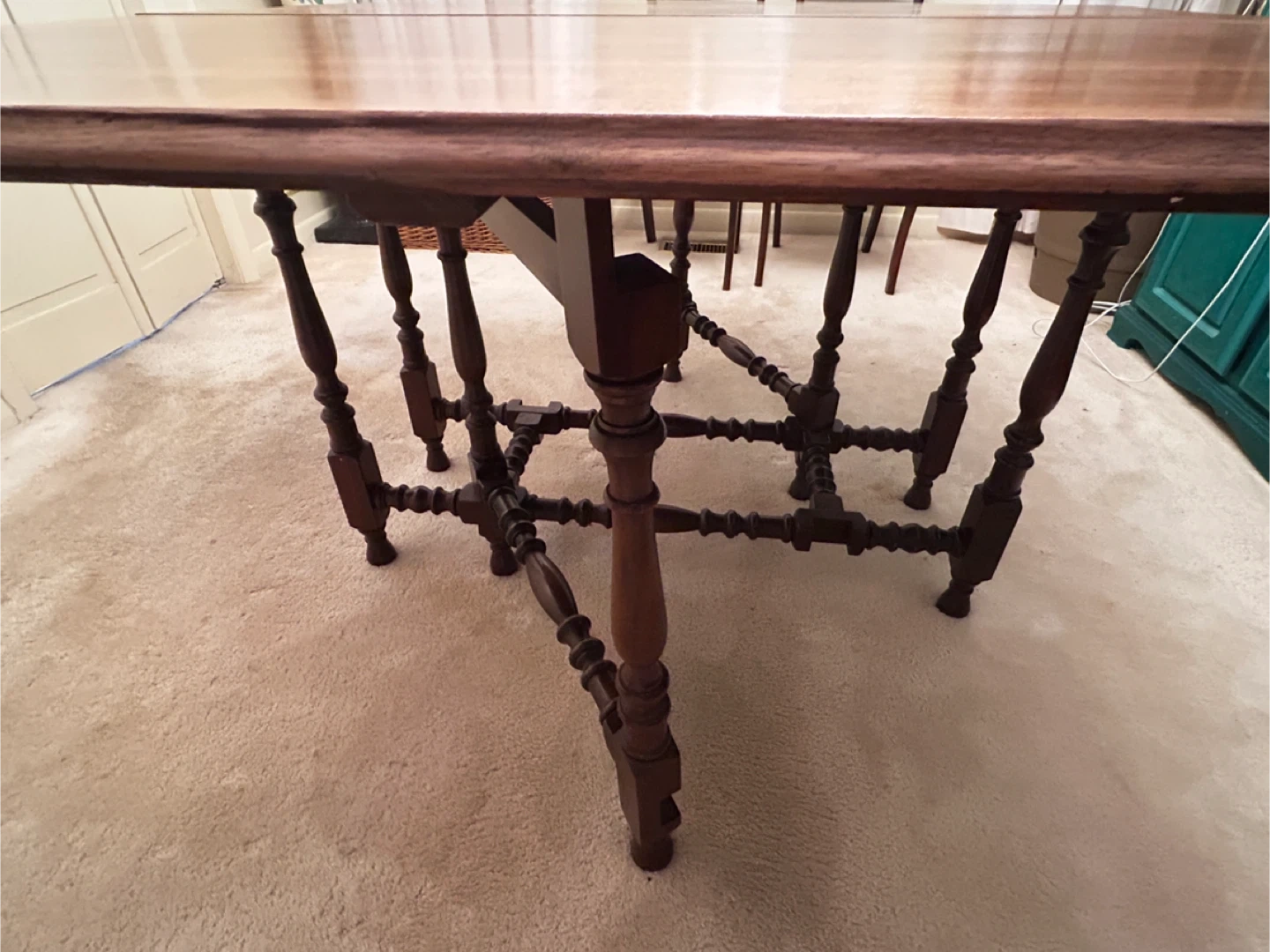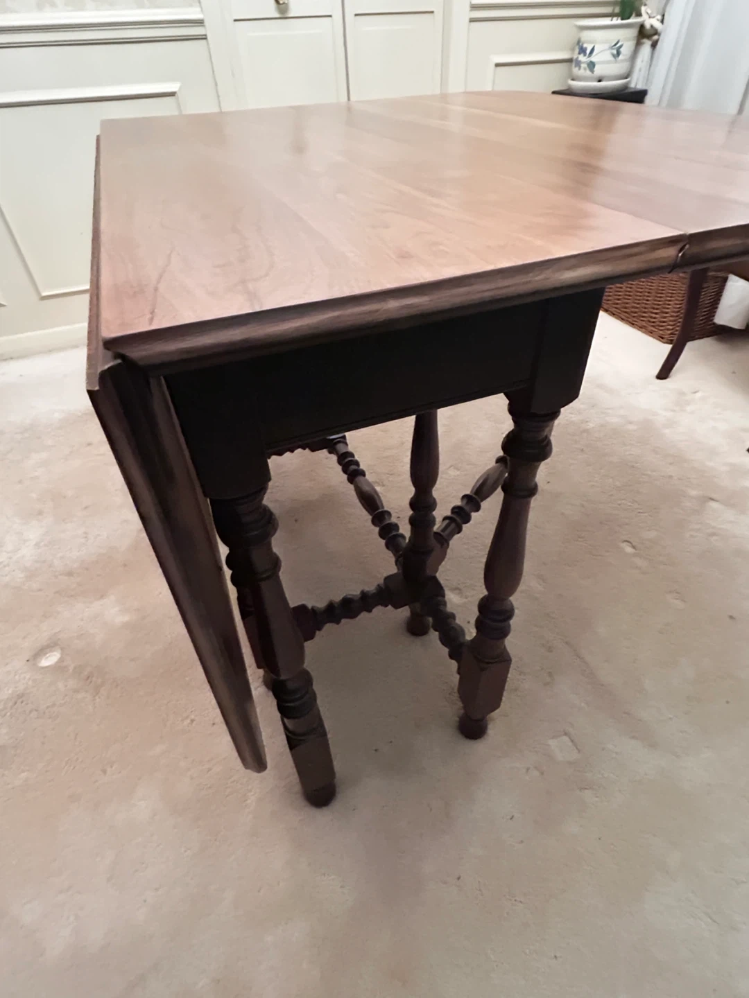 Selling a beautiful antique wood dining table that comes with four matching chairs. The table can be folded down on both sides to make space when not needed. Table size: 40” x 53”. Folded: 40” x 13”. The chairs have green patterned cushions and a classic style. Which are in great condition, but can easily be recovered. A great set to add some vintage charm to your dining room!