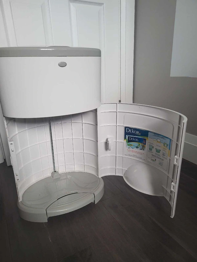 10Dékor diaper pail in great condition. Keeps odors contained and uses standard Dékor refill bags (not included). Hands-free foot pedal makes diaper changes easy and mess-free. Bonus feature: Can use standard trash bags! Retail value: about $70 new Asking $25