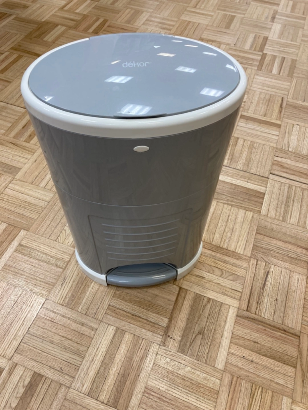 Selling a Dékor hands-free diaper pail in grey! It's in great condition and super convenient for disposing of diapers without needing to touch anything. Perfect for keeping the nursery clean and tidy