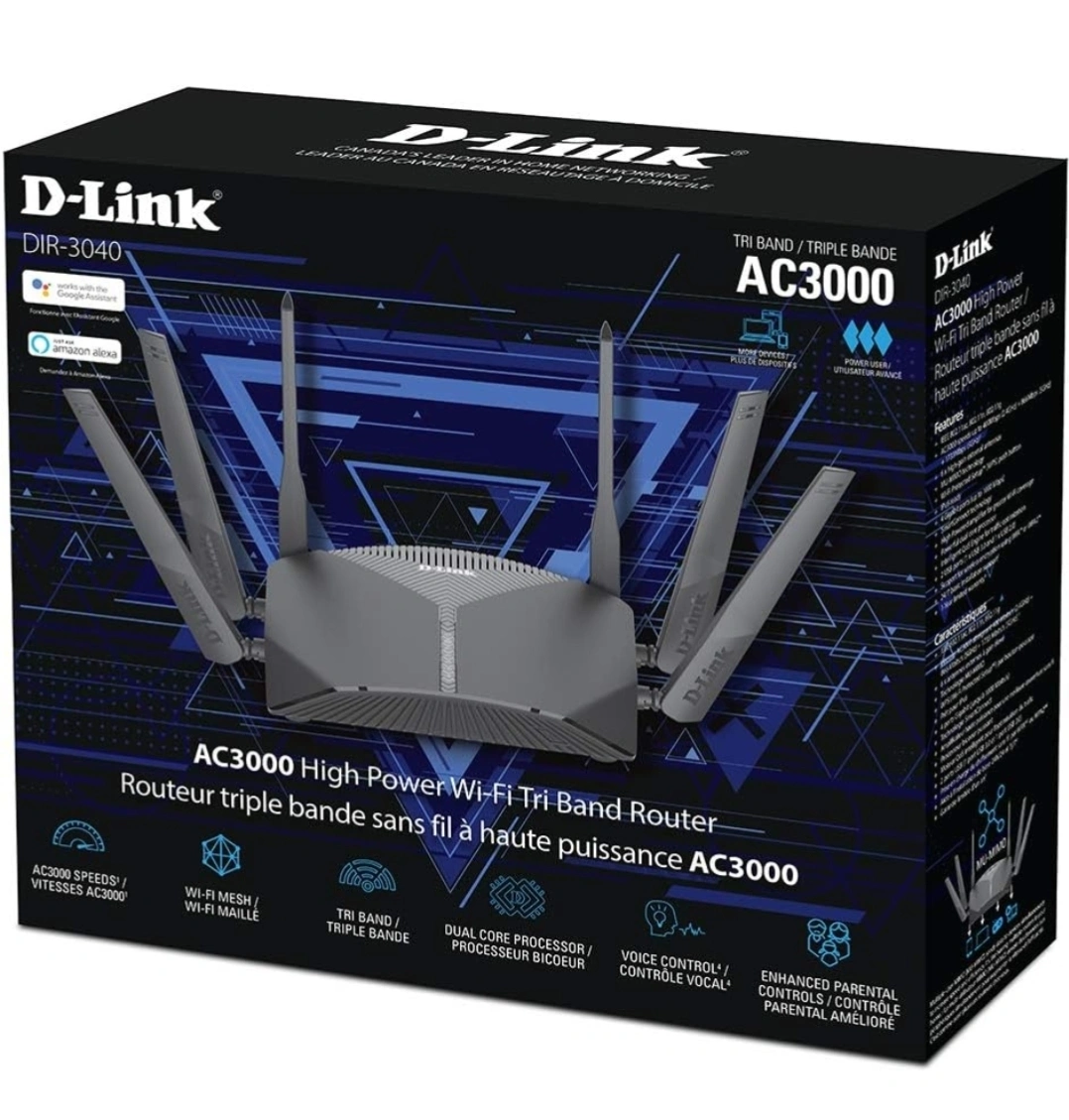 55Selling a D-Link DIR-3040 AC3000 High Power Wi-Fi Tri Band Router. This router features: - AC3000 High Power Wi-Fi - Wi-Fi Mesh - Tri Band - Dual Core Processor - Voice Control - Enhanced Parental Controls - 6 High Gain Antennas - USB 2.0 and 3.0 ports