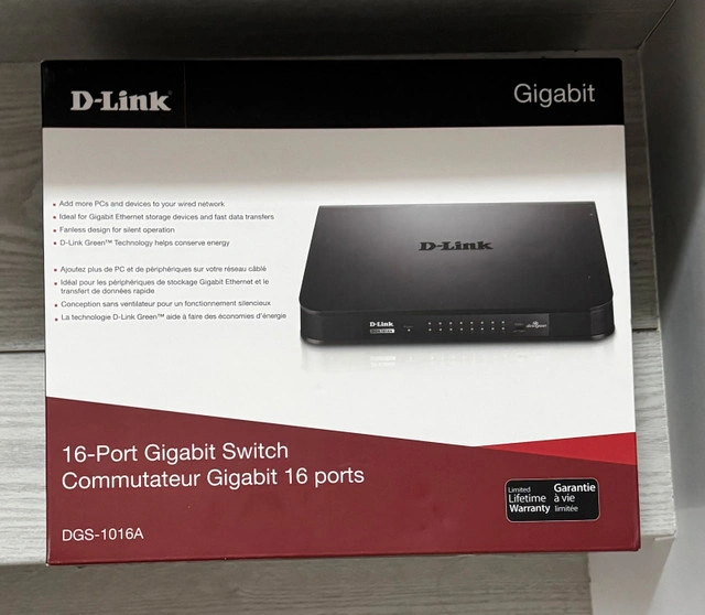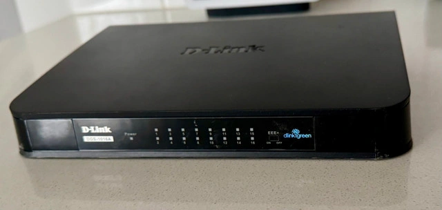 10Selling a used D-Link 16-Port Gigabit Switch (DGS-1016A) that provides reliable wired network connectivity for adding more PCs and devices, facilitating Gigabit Ethernet storage, and ensuring fast data transfers. This fanless design operates silently and uses D-Link Green Technology to conserve energy. Key features include: * 16 Gigabit Ethernet ports * Fanless design for silent operation * D-Link Green Technology for energy efficiency This switch is perfect for expanding your home or office network and is in good working condition. If the ad is up, the switch is available!