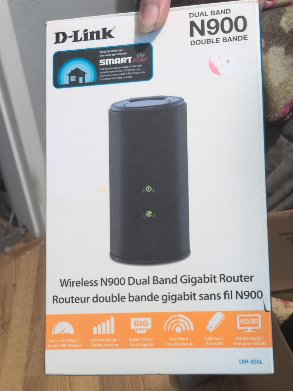 Selling a D-Link N900 Dual Band Gigabit Router, model number DIR-855L! It's a wireless router that supports both 2.4GHz and 5GHz bands, offering up to 900 Mbps. It also features SmartBeam technology for maximum coverage inside and outside your home. It has Gigabit ports and USB port as well!