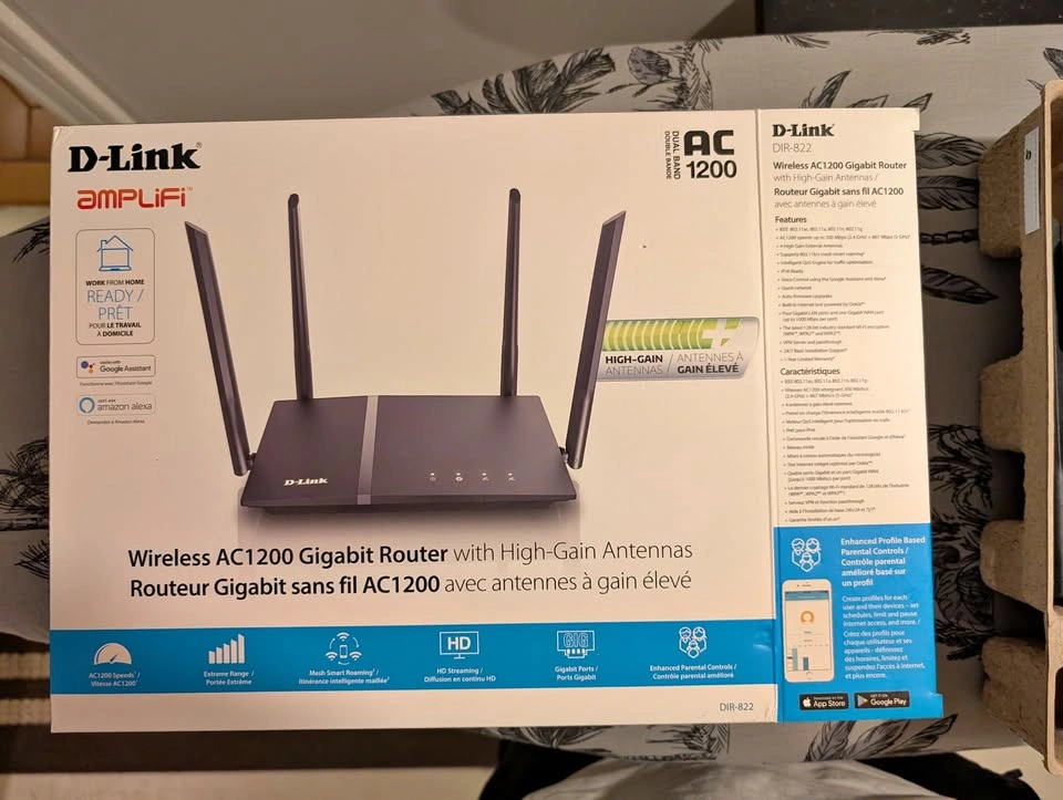 D-Link DIR-822 Wireless AC1200 Gigabit Router with High-Gain Antennas Features: IEEE 802.11ac, 802.11a, 802.11n, 802.11g AC1200 speeds up to 300 Mbps (2.4 GHz) + 867 Mbps (5 GHz) 4 High-Gain External Antennas Supports 802.11k/v mesh smart roaming Intelligent QoS Engine for traffic optimization IPv6 Ready Voice Control using the Google Assistant and Alexa Guest network Auto-firmware upgrades Built-in Internet test powered by Ookla Four Gigabit LAN ports and one Gigabit WAN port (up to 1000 Mbps per port) The latest 128-bit industry standard Wi-Fi encryption (WPA™, WPA2™ and WPA3™) VPN Server and passthrough