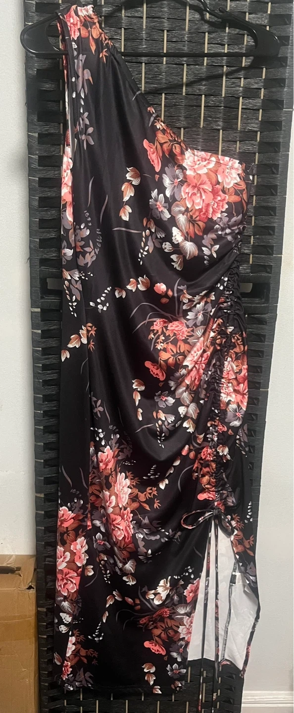 This striking black maxi dress features a vibrant floral print with hints of pink and coral. It has a flattering one-shoulder design and a ruched side with a drawstring tie for adjustable styling and a high slit. The fabric's satin-like finish adds a touch of elegance.