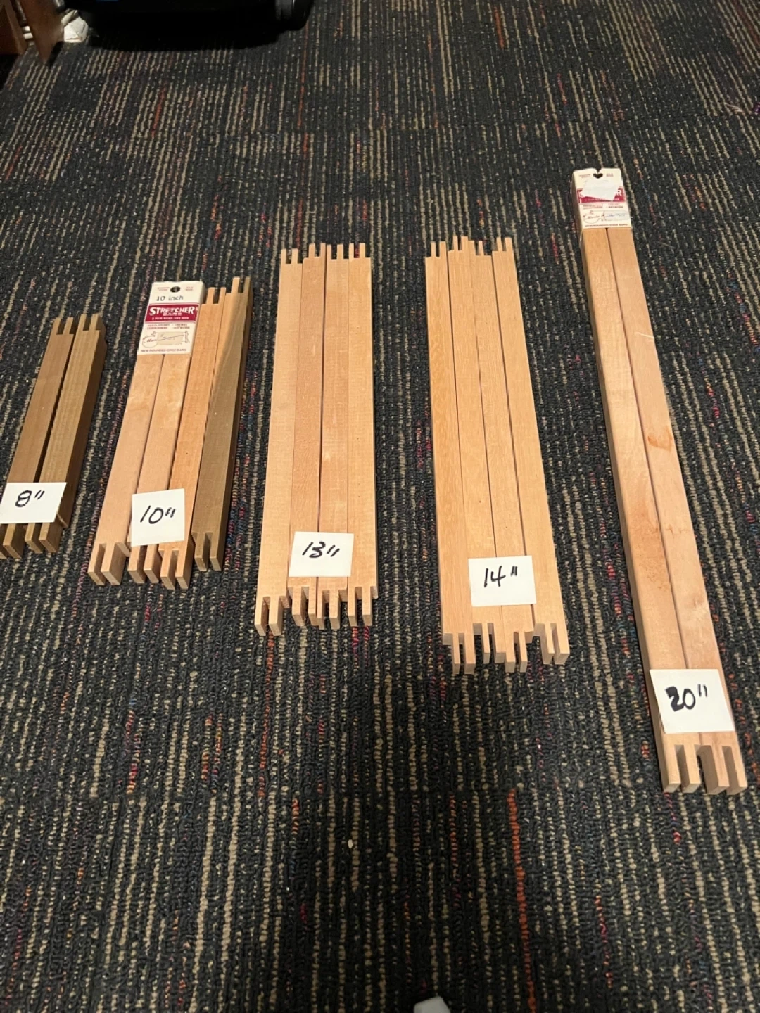 This lot includes wood stretcher bars for building custom canvas frames. Assorted lengths are available, with some measuring 8", 10", 13", 14", and 20". These bars are pre-notched for easy assembly. They're great for artists needing specific frame dimensions.