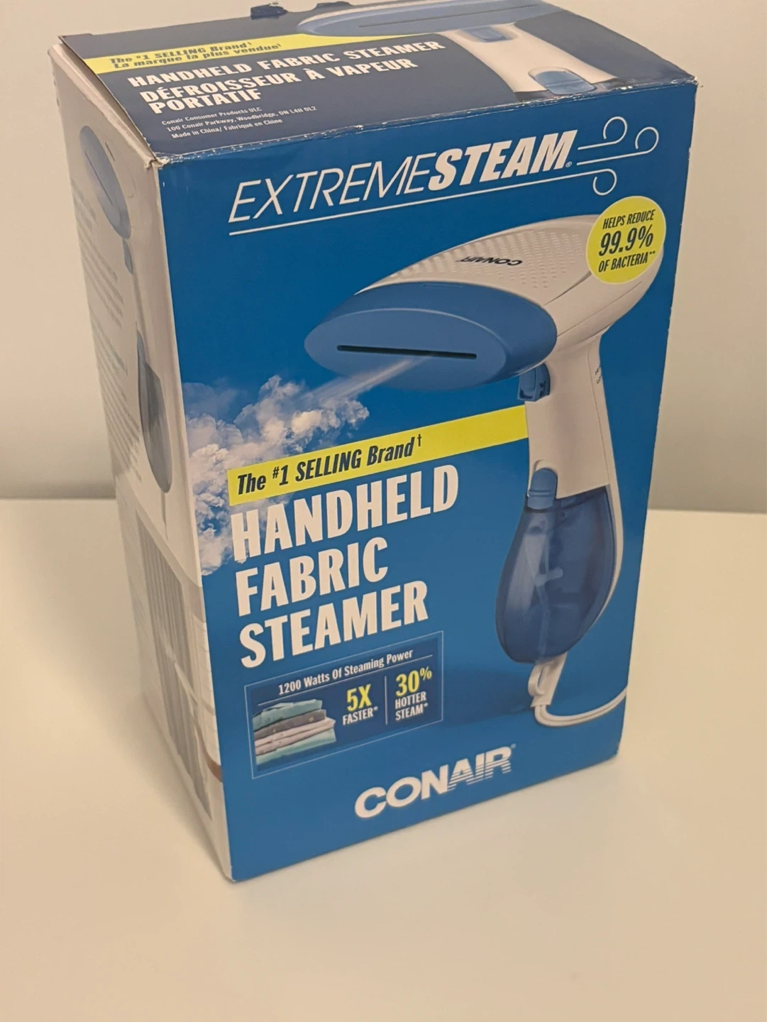 This is a Conair ExtremeSteam handheld fabric steamer. It offers 1200 watts of steaming power and is 5X faster with 30% hotter steam. It also helps reduce 99.9% of bacteria.