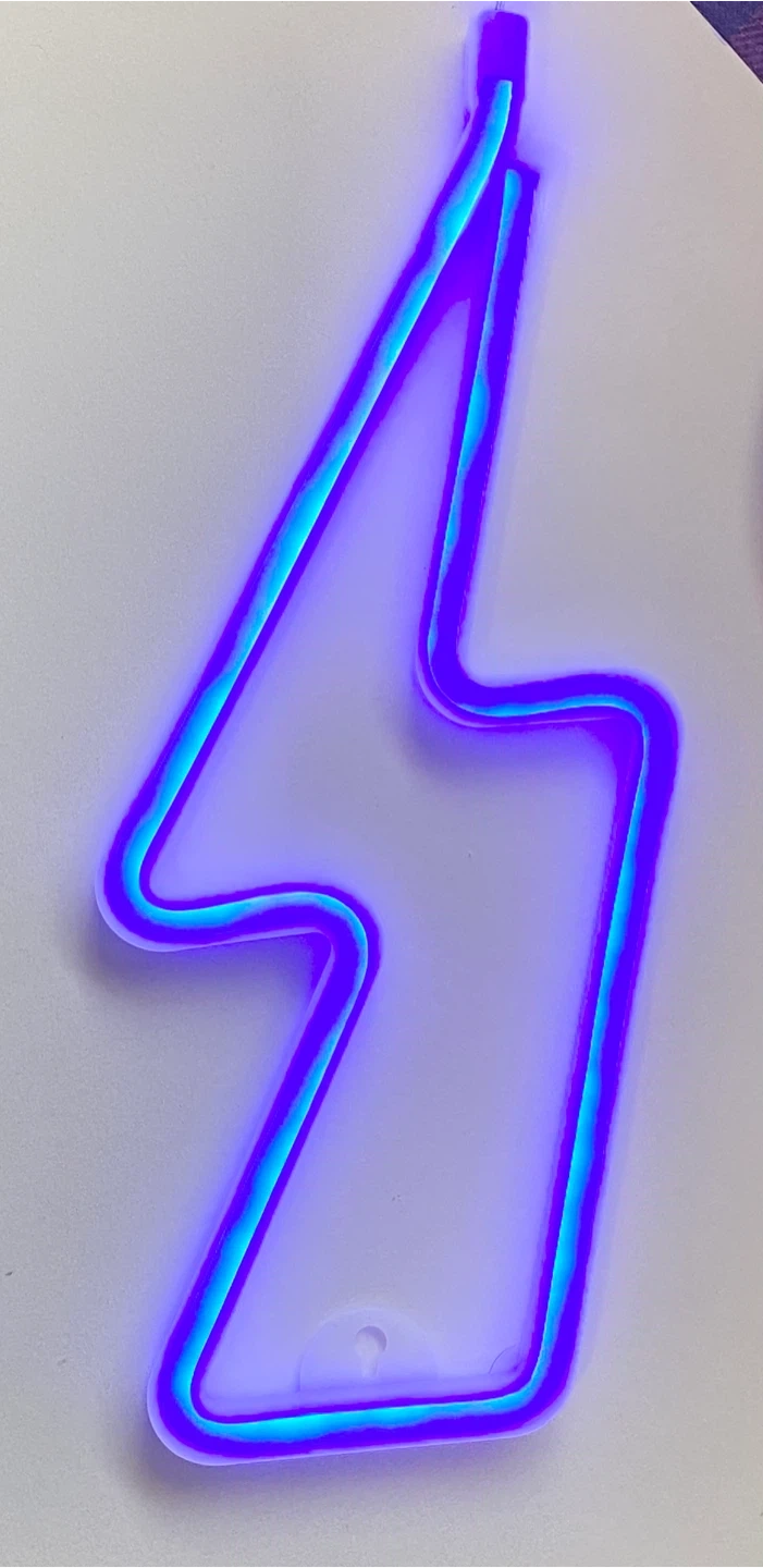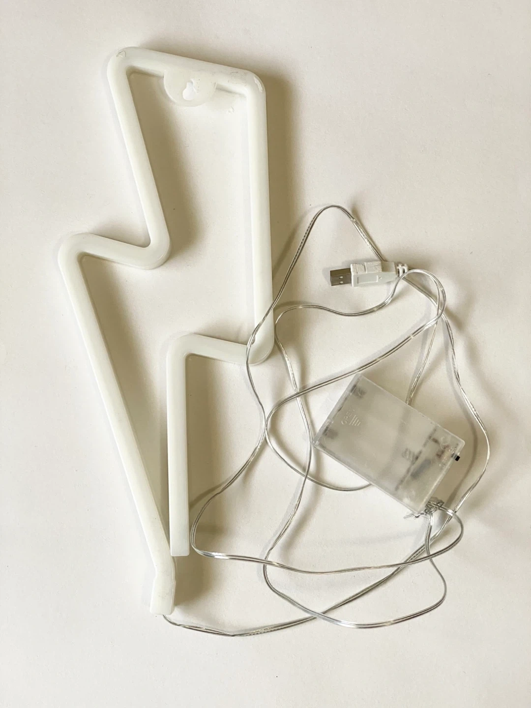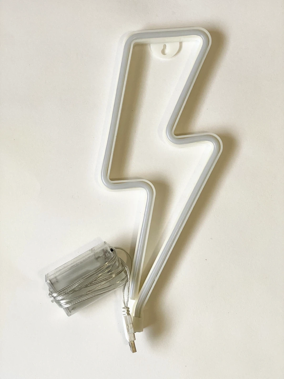 This is a bolt-shaped LED neon sign light. It's powered by USB and includes a battery pack. White in colour. The battery pack and some areas of the sign have adhesive on it from tape.