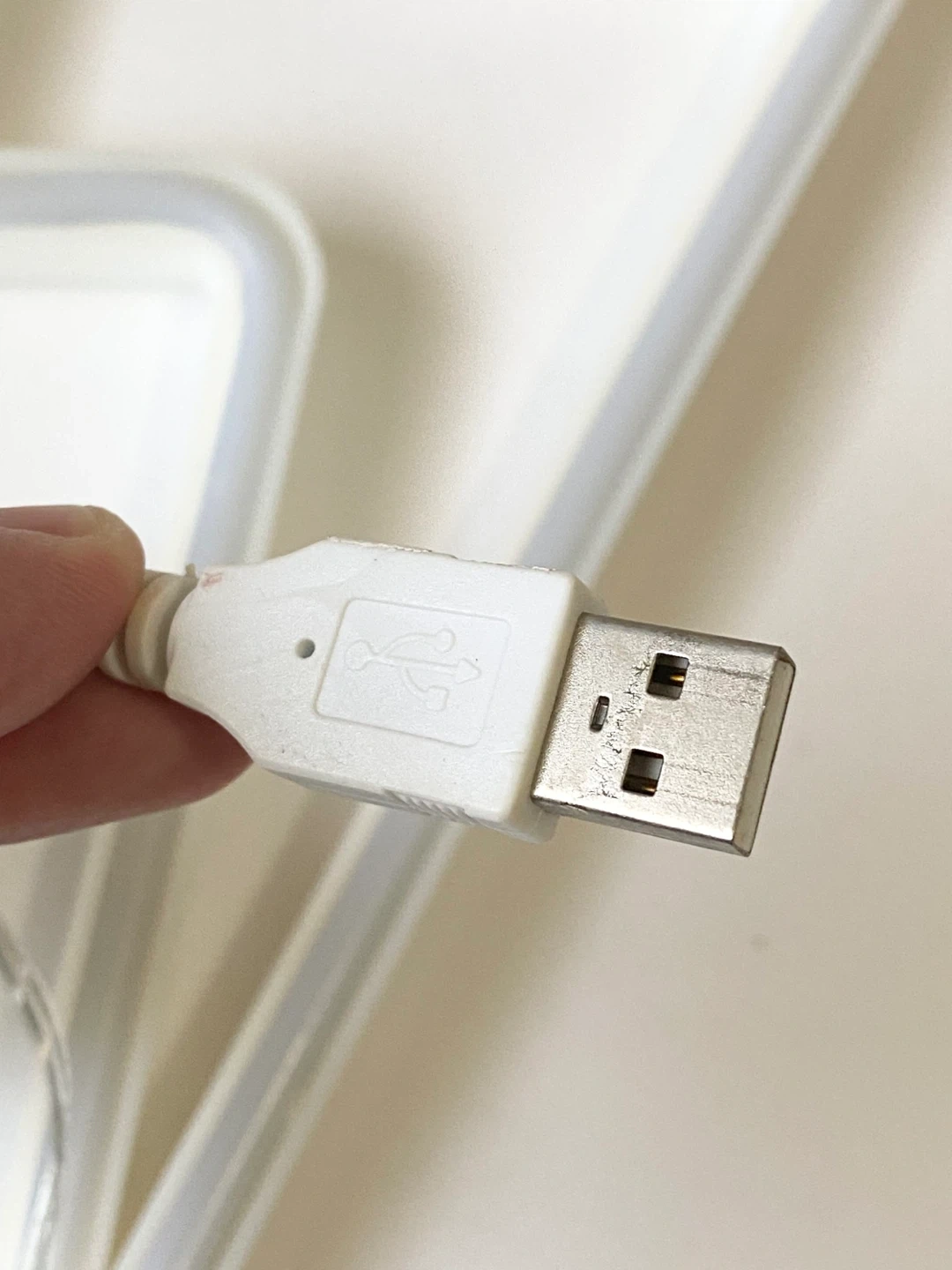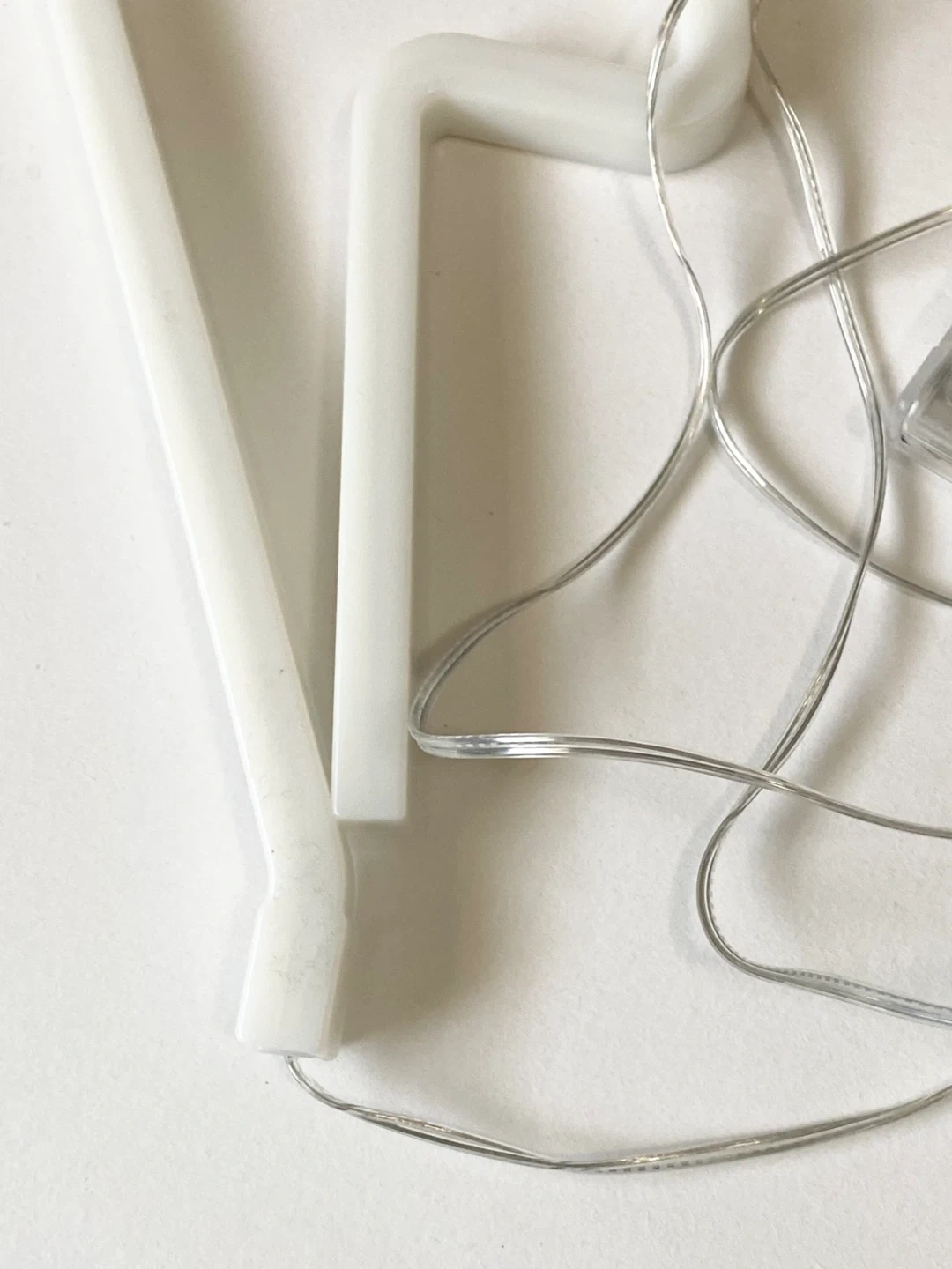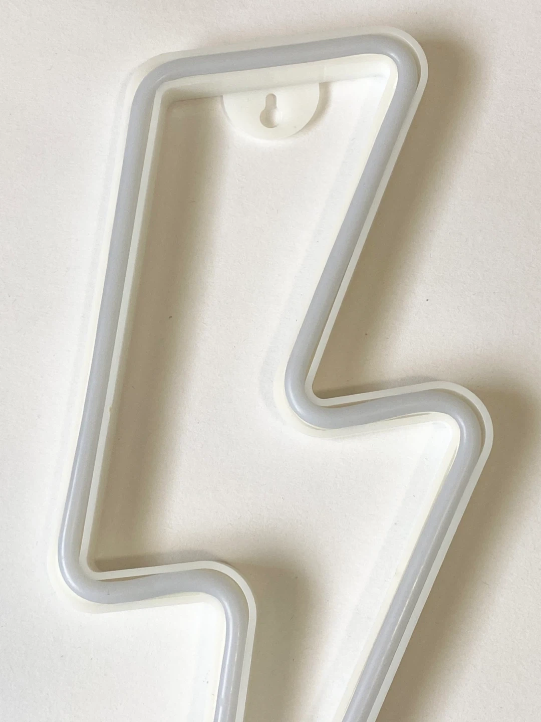 This is a bolt-shaped LED neon sign light. It's powered by USB and includes a battery pack. White in colour. The battery pack and some areas of the sign have adhesive on it from tape.